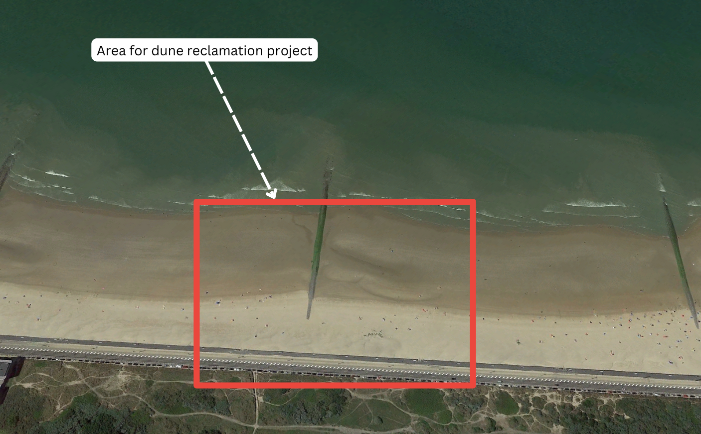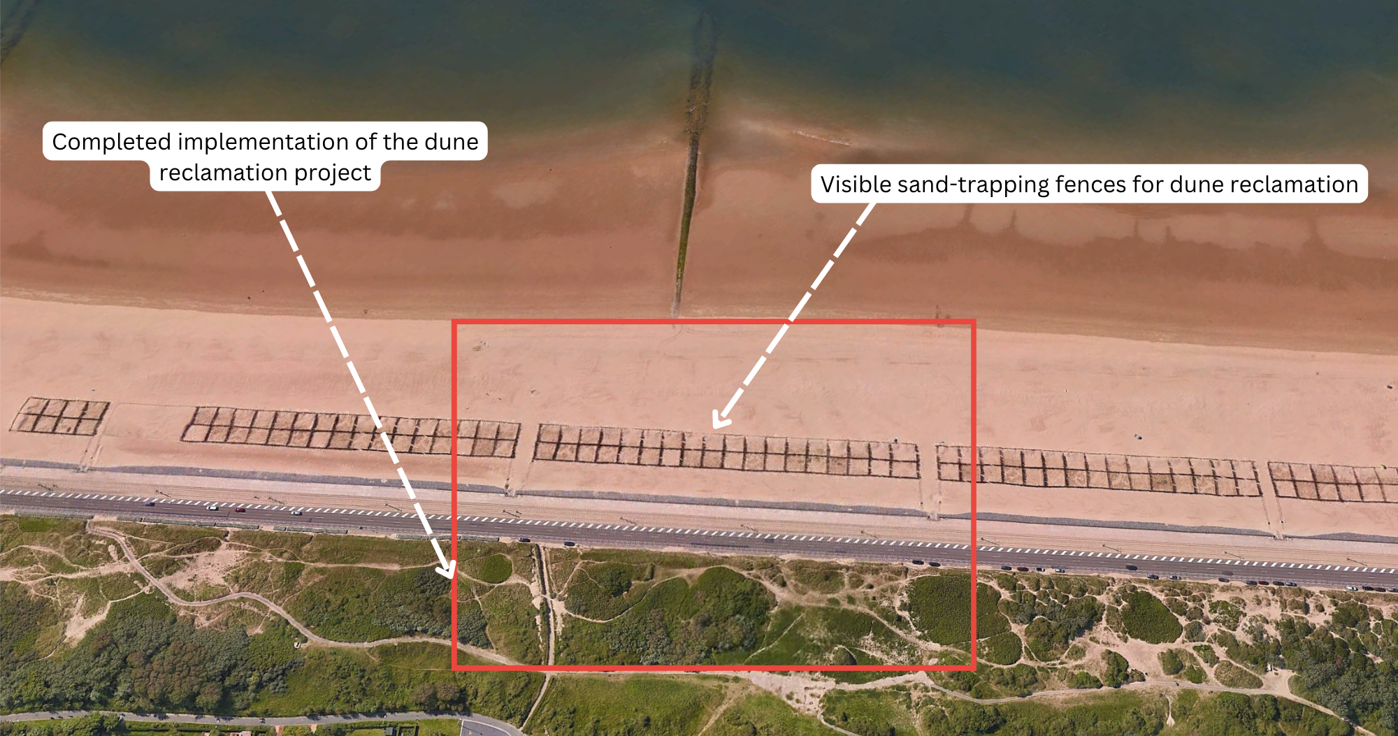 The two images above (Figure 35-35a) compare the Raversijde project. The first image from July 2020 shows the beach area before the project started, and the second image shows the dune reclamation completed by June 2021. Dune reclamation efforts are visible with the construction of sand-trapping fences, which work to preserve and build dunes by reducing wind speed and directing visitor traffic away from these ecologically sensitive dunes.