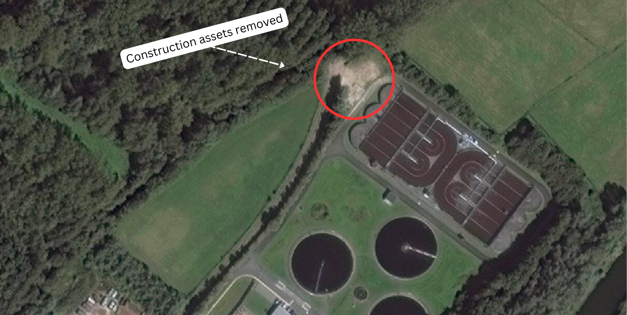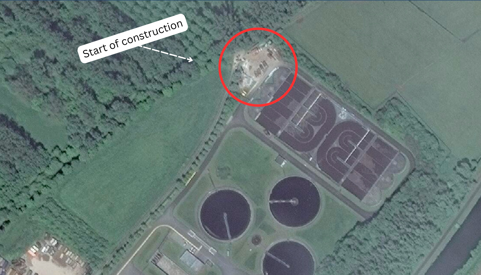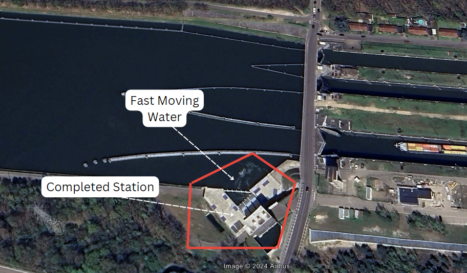 Finally, Phase Four is when the project is completed and operational. In this image from April 2023 (Figure 7), the Diepenbeek pumping station is complete and operational as evidenced by the completed building, removal of construction equipment, and grass has started growing in the areas where the vehicles and materials had previously been staged. Additionally, signs of fast-moving water currents near the pump indicate that the pumping station is taking in water. With the Diepenbeek site as a case study, from its initial land clearing before August 2020 to completion of the station in October 2021 (with the pump itself not starting until January 2022), it is estimated to take a year and a half to complete one of these pumping stations.