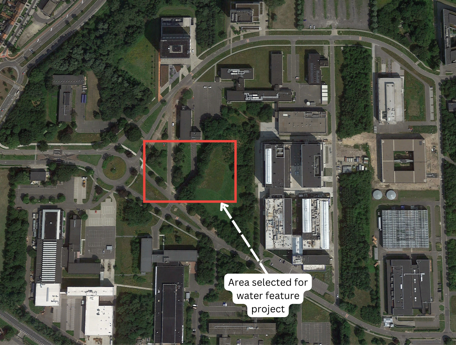 This image (Figure 15), originally posted on the Ghent Tech Lane website, highlights all the areas on the campus where water feature work and underground pipelines were to be installed.