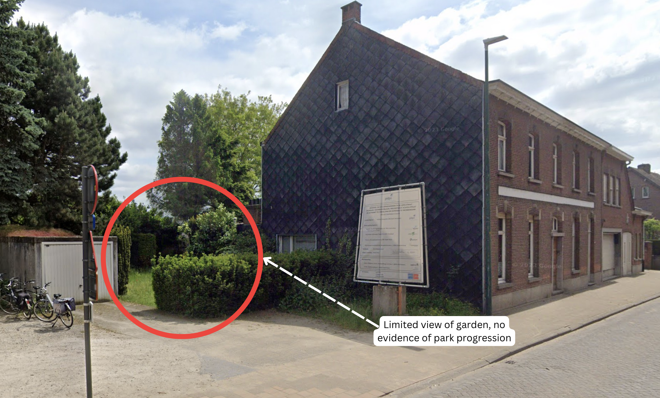 As of May 2023 (Figure 46), the ground image of the garden behind Lepelstraat 1 shows no visual indications of paved park conversion or public availability indicating that the "quick win 2" project has not started.