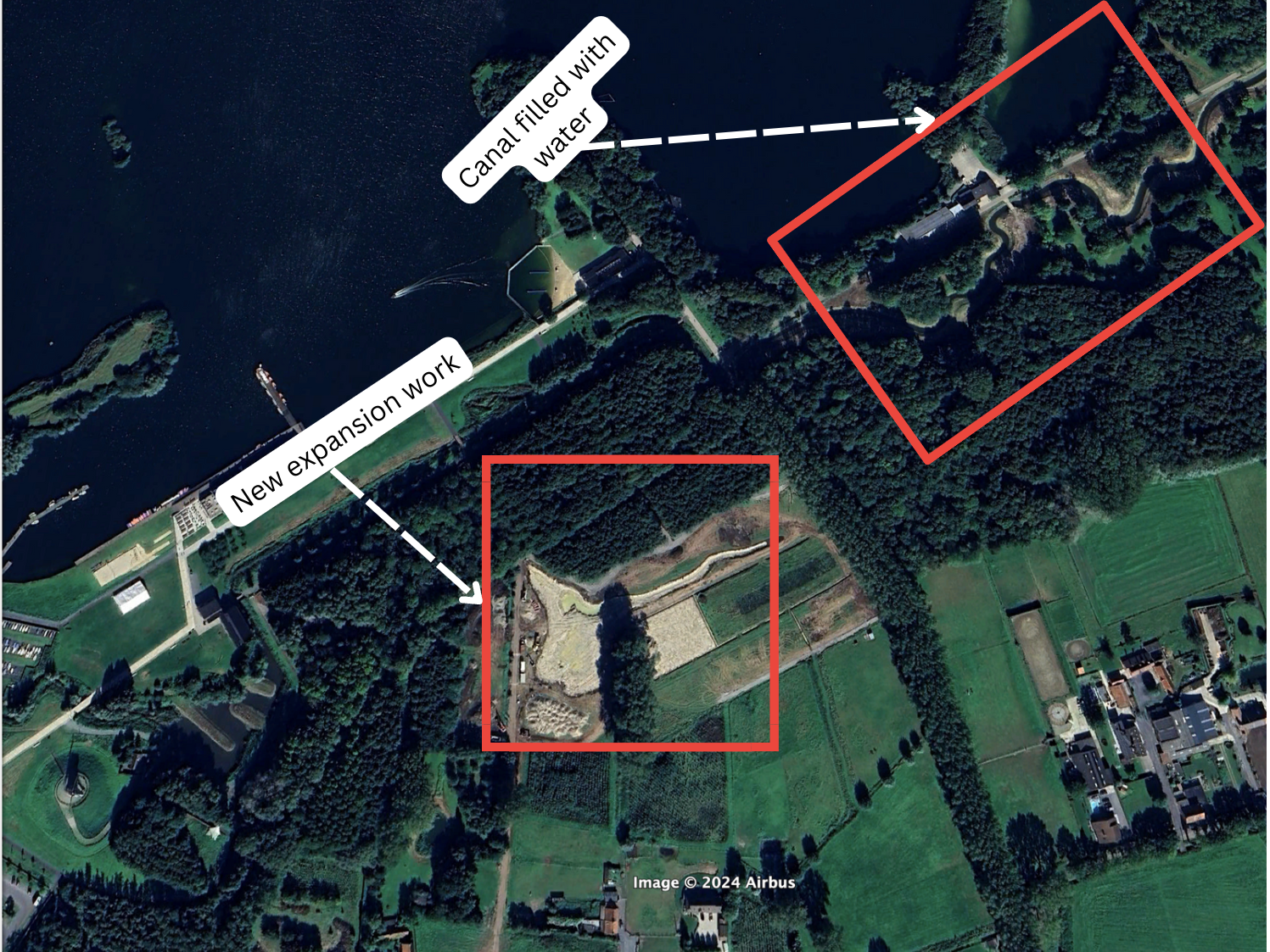 The Figure 8 image shows a construction crane and land disturbance at the site indicating Phase Two preparation. This coincides with an article from a November 2023 local Flemish newspaper indicating that "the construction of the hydroelectric power station at a lock-in Genk-Zuid has started.” From the image and article, the pumping station at Genk was likely in Phase Two by February 2024, and reports from June 2024 project that the Genk lock will be complete by Summer 2025.