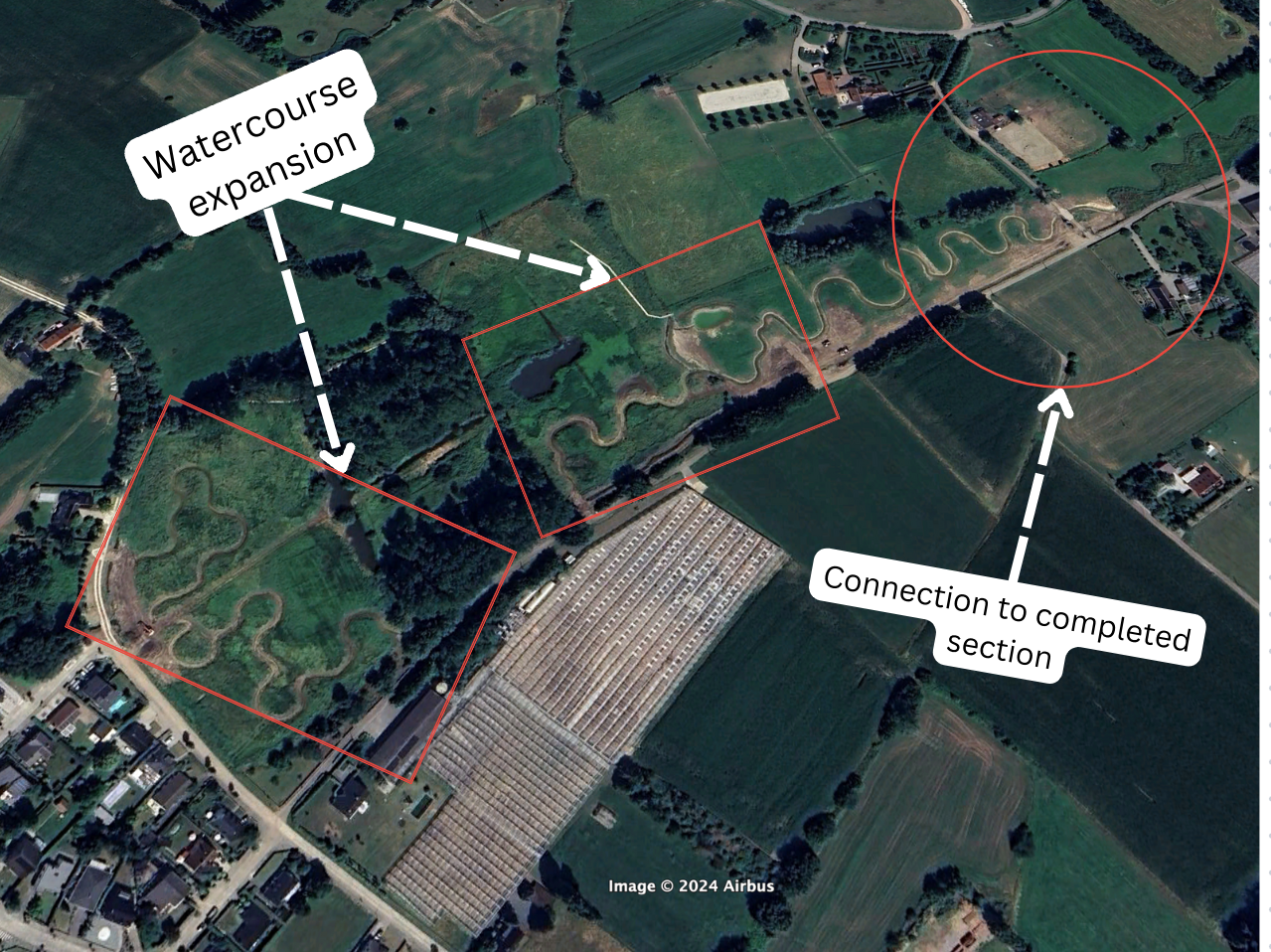 A baseline image from May 2021 (Figure 29) shows the general area of the watercourse expansion work. The image also shows early meandering work, indicating the project started along planned timelines.