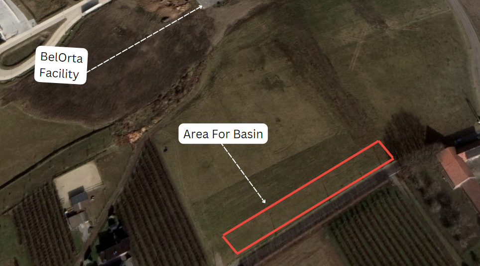 In the summer of 2021, fruit and vegetable company BelOrta announced they would be constructing a "state-of-the-art sorting warehouse for apples and pears." This fruit warehouse is a private venture of BelOrta. Also happening concurrently and with encouragement and approval from the city of Borgloon, BelOrta is also supporting a “water basin” that collects rainwater runoff from the existing BelOrta buildings and pavement. The basin is listed on the Blue Deal project page and is also part of the larger "Collective Rainwater Projects" of the Blue Deal. Projects that are part of the collective rainwater projects groups aim to improve the rainwater regional catchment abilities. For this specific basin, the regional government allocated approximately “200,000 Euros." Construction of the buffer basin, finished in mid-June of 2023, can hold approximately “488,000 Liters” of water, allowing local farmers to utilize pesticide-free water. According to the Flemish Minister of the Environment, the basin will, “save a massive amount of water that they would otherwise have to pump from either local waterways or the ground.” This basin helps the local community with its farming needs by saving approximately “2,500 meters cubed (250,000 liters) per year."
