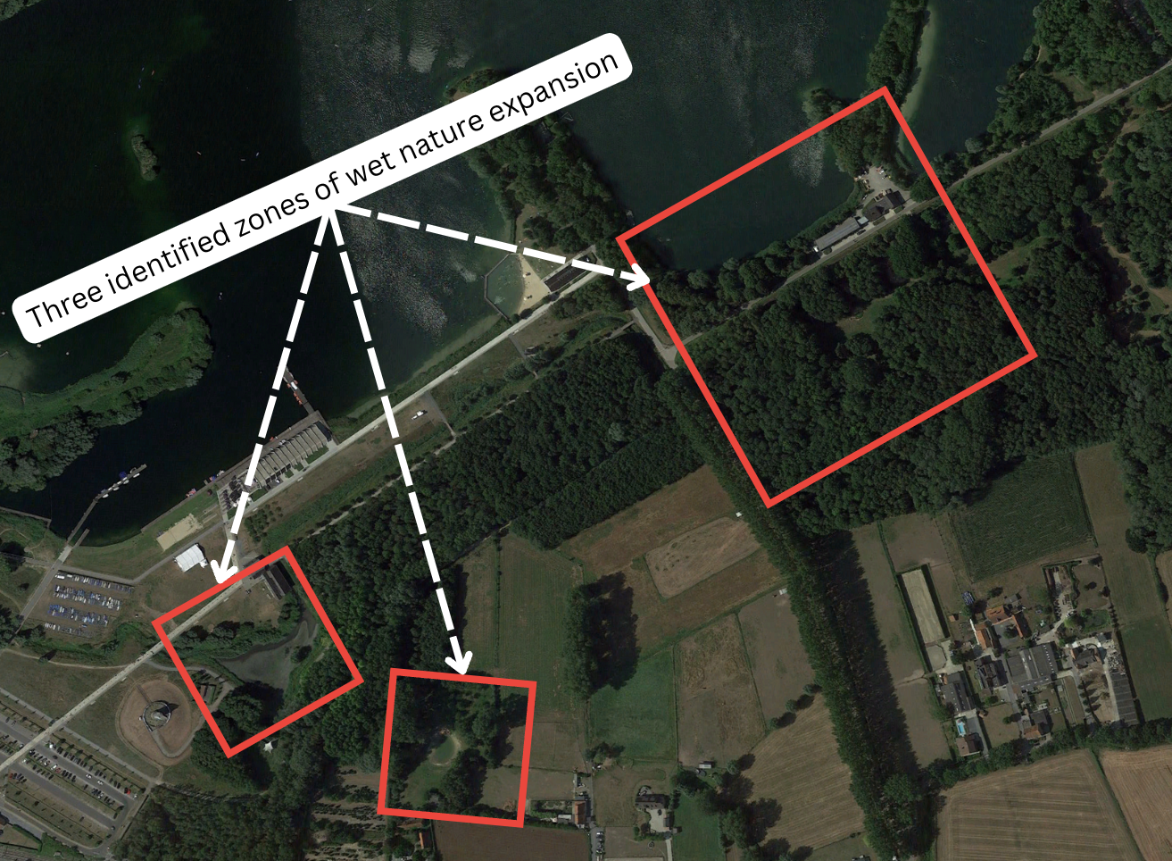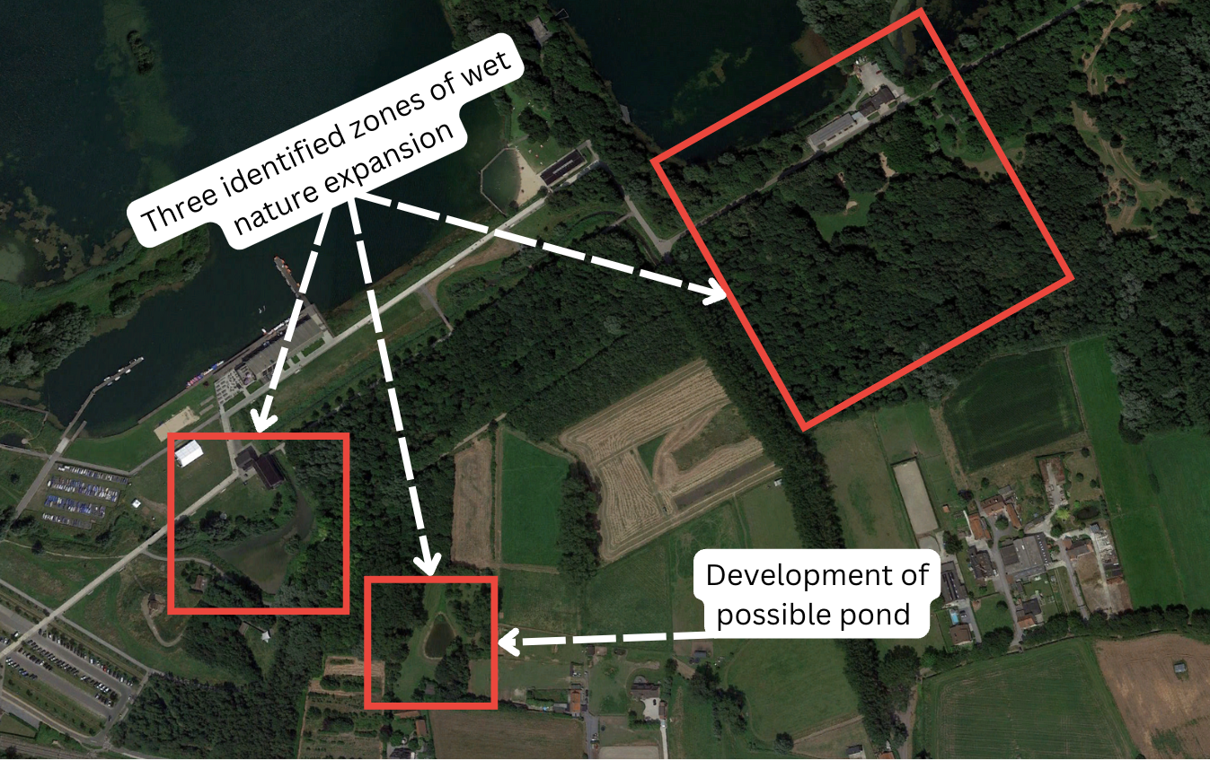 The plan for the De Gavers provincial domain identified three areas for green improvements (Figure 25). As of July 2020, there were no indications of new bodies of water or changes in landscapes, indicating the project had not yet started.