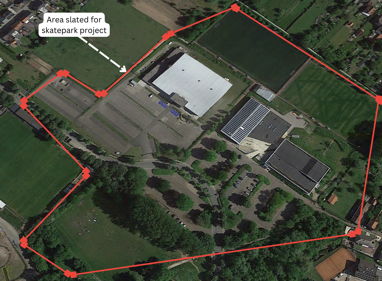 The cleaning up of the Dender Landscape is an area project coalition affiliated with the Blue Deal through its listing on the Blue Deal website. The projects associated with this project coalition aim to redesign public spaces to make water a central facet of the space. The Sports Site in Liedekerke is an example of a civic project adding green elements to meet the goals of the Blue Deal. In this case, the project aims to create a skatepark bowl that will also serve as a water catchment site to filter rainwater into reservoirs. Thus, during dry weather, the skatepark would be used by citizens for entertainment, but during heavy rains, it would function as a man-made pond funneling rainwater into the reservoir system. This design for the skatepark seems to be conceptually similar to projects in Denmark and Norway that have designed skate bowls to collect rainwater that will either have drainage or canal systems that lead the water out of the bowls and into larger basins or reservoirs. The project in Belgium was scheduled to start in 2023 with a planned completion date of 2026.