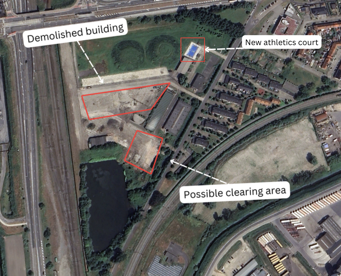 This last image from June 2023 (Figure 40) indicates the demolition of additional buildings and clearing activity. The addition of an athletics court can also be seen in this image. The planned wadis and infiltration moats are not visible. According to the Blue Deal project website, the park is projected to be done by 2024.
