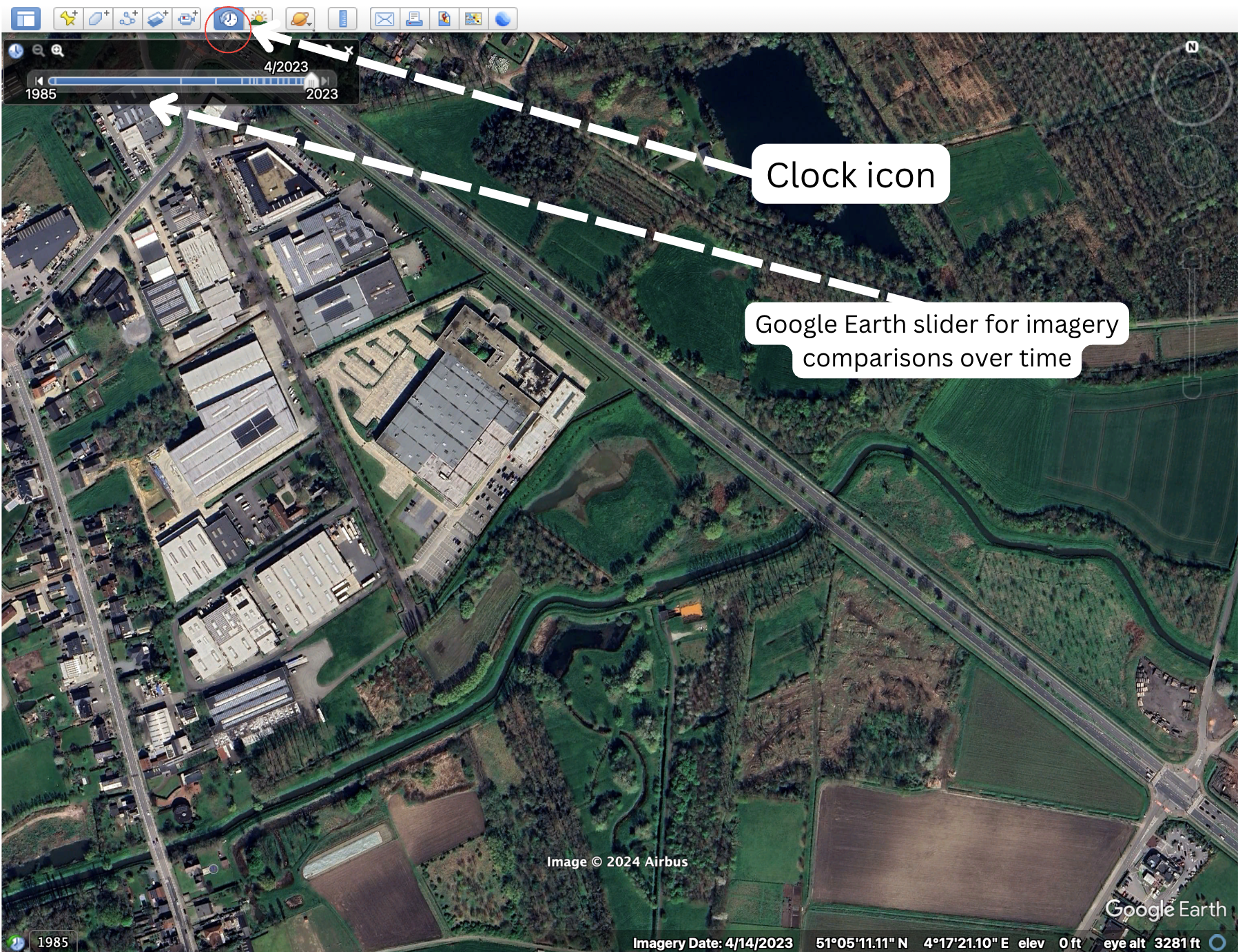 The image above highlights the use of the Google Earth slider that was applied to a portion of projects for the "light assessments" in the excelBlue Deal Master DatabaseAssessment column and kmlBelgian Blue Deal 2024KMZ annotation bubbles.
