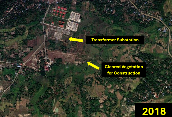 The gas-fired combined cycle power station was built by Kyaukphyu Electric Power Co. Ltd., a joint venture between SOEs Power China Resources and Myanmar's Supreme Group. According to The Irrawaddy, the station is a 135-megawatt power plant that uses Myanmar's share of natural gas to power the Kyaukphyu region. A press release from Power China Resources noted the power station began operation in October 2022, stating that Power China has "fulfilled its social responsibilities" and intends to "strengthen cooperation under the [BRI] and the [CMEC]." Imagery analysis from 2018 to 2023 showed consistent annual development of the gas-fired power station. In 2018, only the administrative buildings and dirt roads for transport were constructed (Figure 21). In 2021, farmland was cleared for development of the combined cycle turbine to power the station with a completed substation southwest of that (Figure 22). Imagery also showed development of roads for construction vehicles. In 2022, the construction site was widened considerably for the foundation of pipes that would run natural gas to the turbine (Figure 23). Imagery showed the excavation for a man-made cooling lake. In 2023, the power station was completed with the addition of water in the cooling lake (Figure 24).