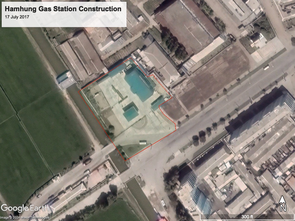 - This would be consistent with a trend that shows increases in gas stations around North Korea since 2016. See Jacob Bogle, “Fueling the country: tracking North Korea’s growing number of gas stations,” North Korea Professional Research Platform, October 11, 2019, https://www.nknews.org/pro/fueling-the-country-tracking-north-koreas-growing-number-of-gas-stations/, Accessed June 5, 2024. Bogle claims there are seven gas stations in Hamhung, though his search probably included the port area of Hungnam, See Jacob Bogle, “Kim Jong-un’s First Decade - Gassing Up the Country,” AccessDPRK, September 1, 2021, https://mynorthkorea.blogspot.com/2021/09/kim-jong-uns-first-decade-gassing-up.html, Accessed June 5, 2024.