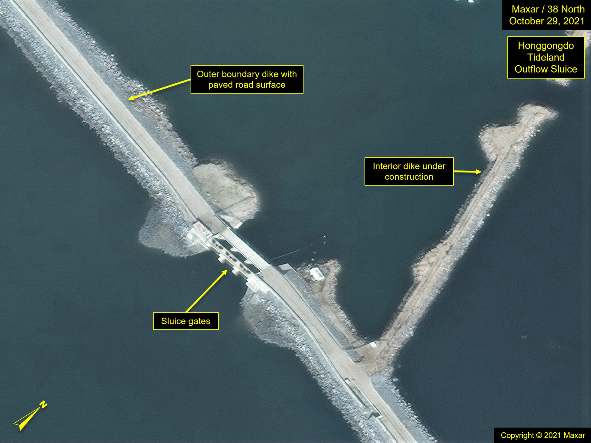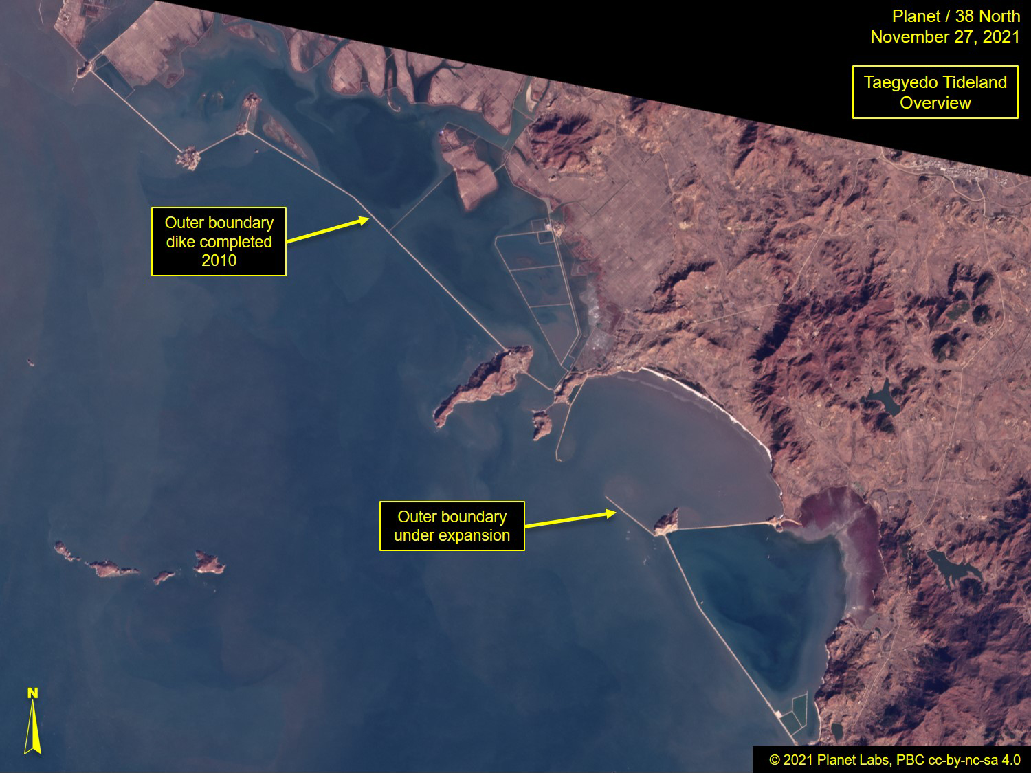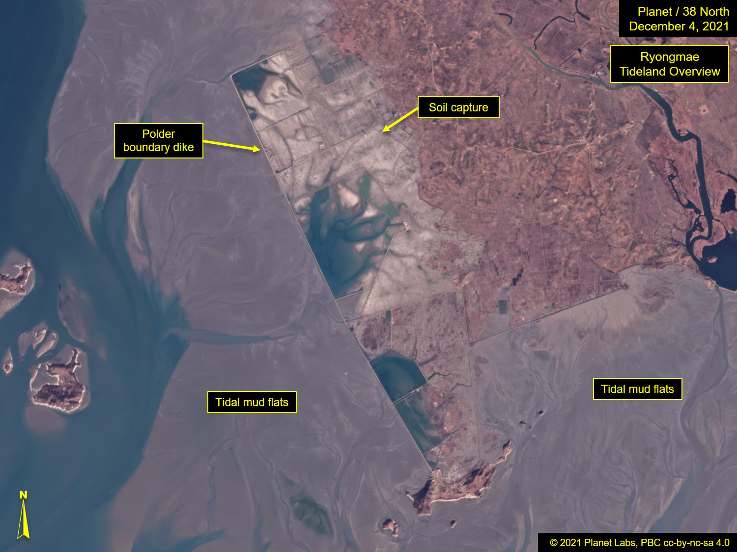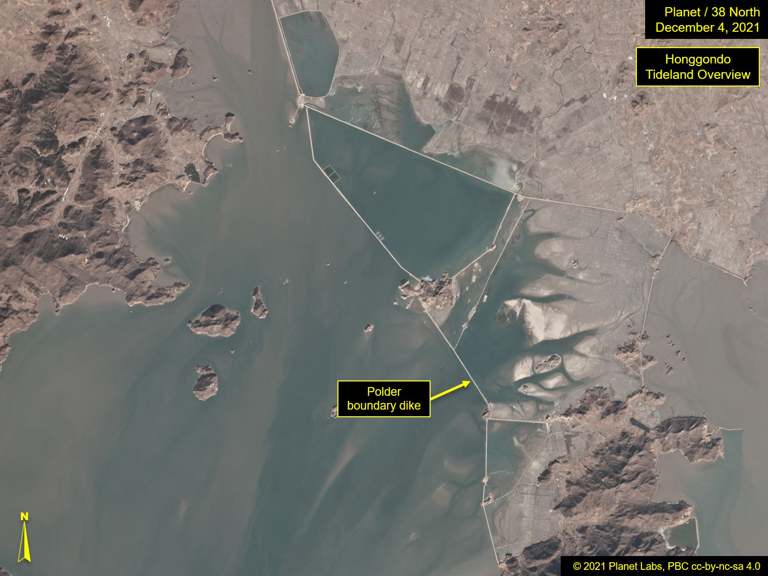 In May 2021, state media touted the second-phase completion of Honggondo Tideland, stating it was "largest in its scale in history of tideland reclamation" and that this phase was completed in half the anticipated time (four years instead of eight).11 The site was highlighted again in September for large-scale rice fields, but due to limited recent commercial satellite image coverage, the current status cannot be confirmed.12