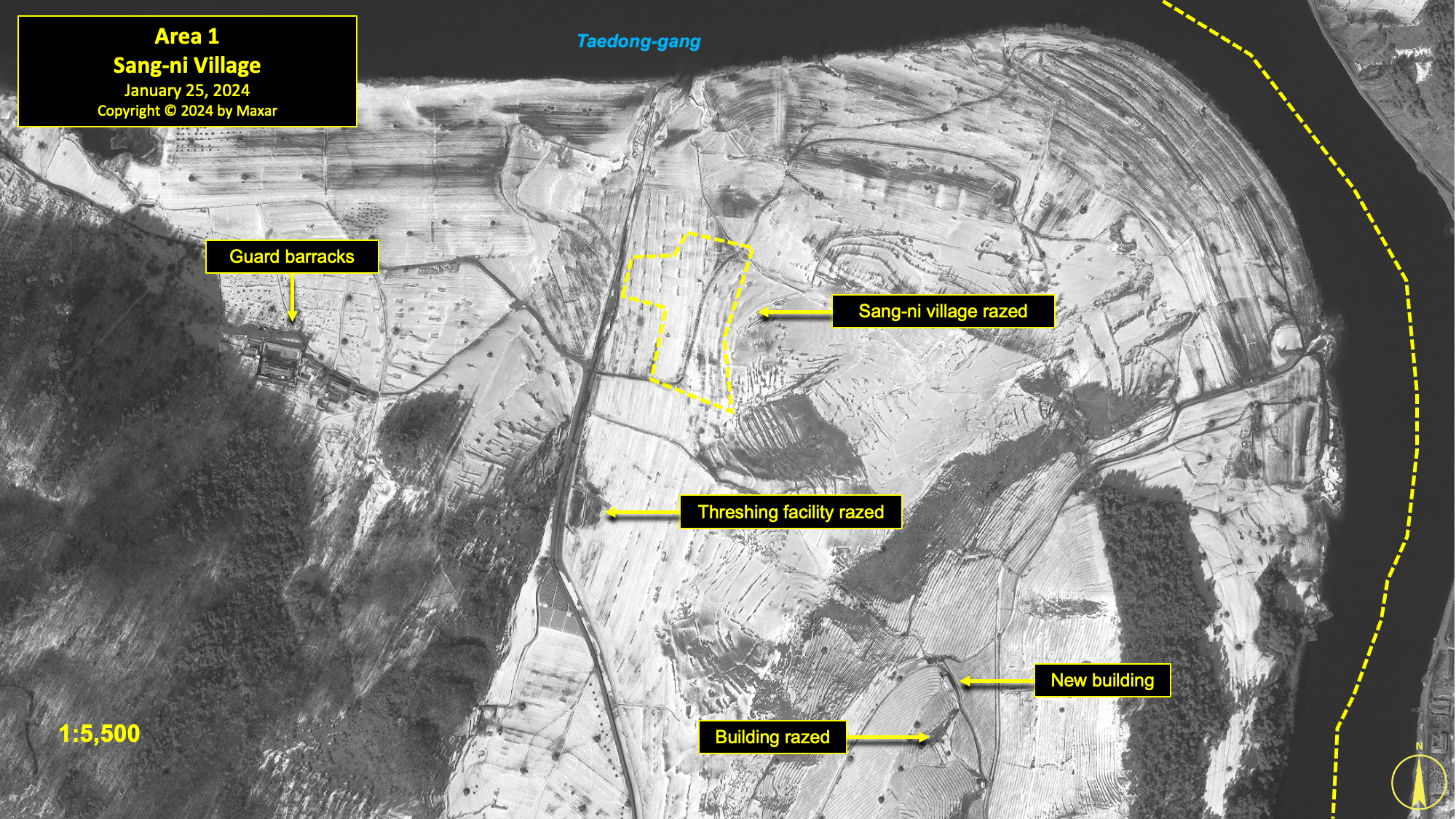 Although the village historically identified as Sang-ni was razed in 2016, an unnamed, larger village located approximately 1 kilometer to the south-southeast is visible in all available satellite imagery. Given the common practice in North Korea of naming groups of small villages (especially farming villages) using the same name, it is likely that this village is also known as Sang-ni. For clarity, this report will identify it as Sang-ni South.