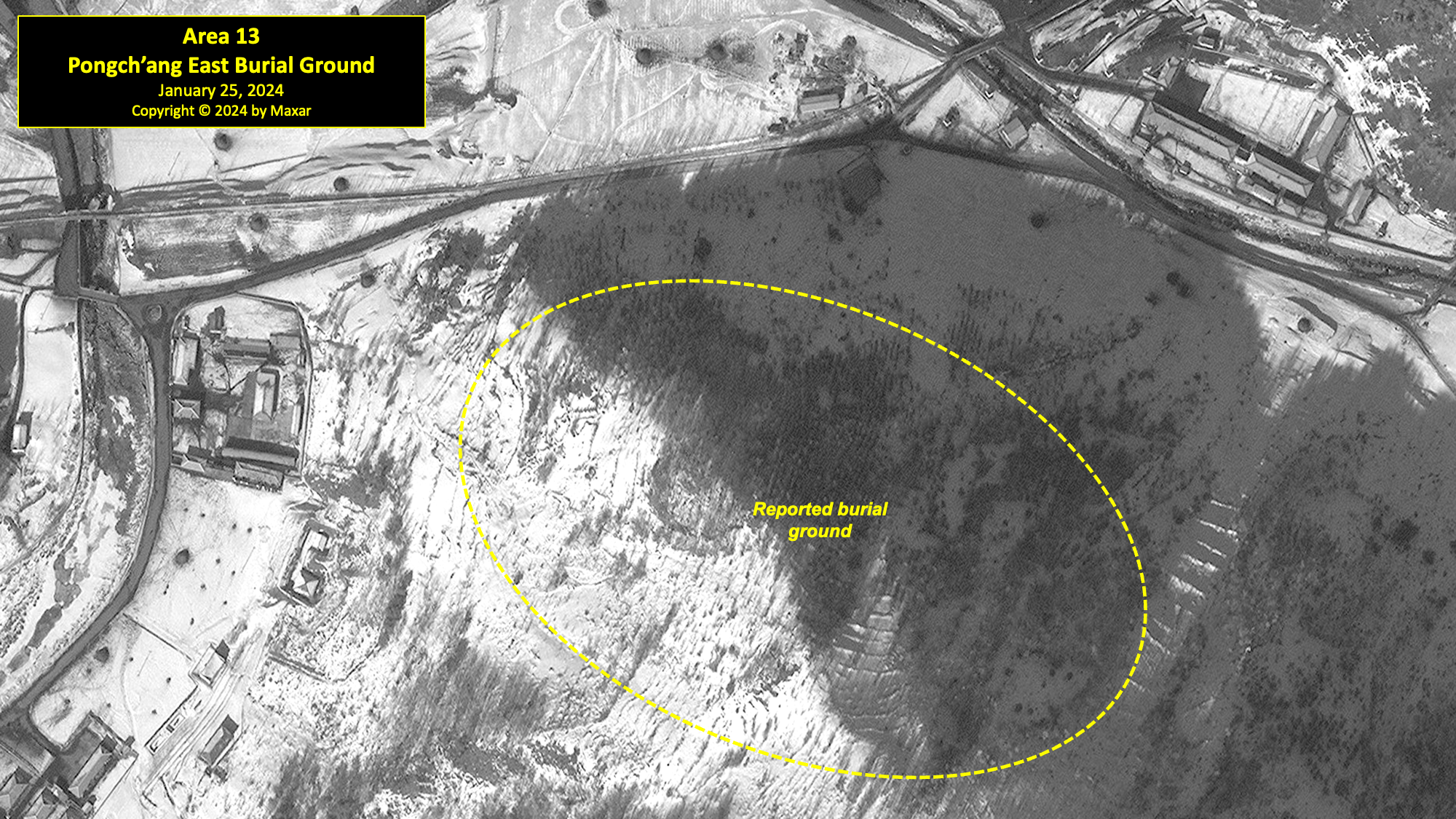 This burial ground is located on the east side of Pongch’ang and is the second such site identified by a former detaineeIbid.[41]is on the northern slope of a small, wooded hill east of the village. As with the Sang-ni location, except for typical agricultural activity, this area has remained unchanged in satellite imagery since at least 2007. Satellite imagery has not detected any indications of burial sites.