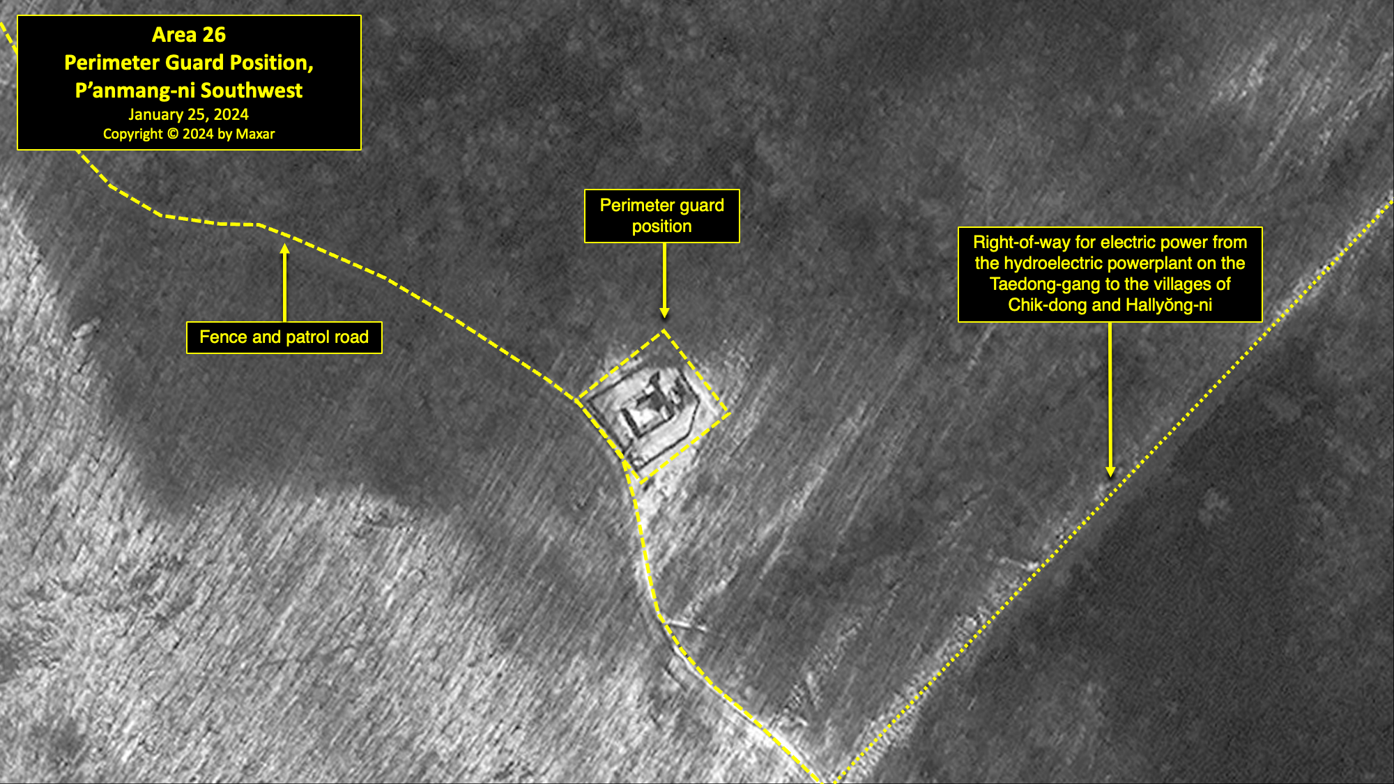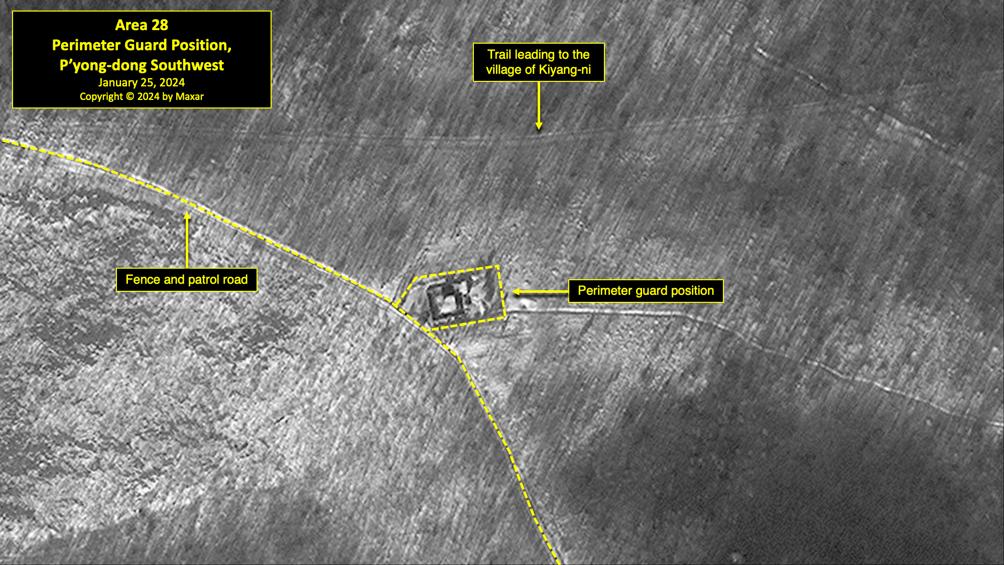 Located on the western perimeter, 2.6 kilometers southwest of P’yong-dong, there is another double-walled guard position. This position was constructed in 2015, replacing an older guard position located 280 meters to the northeast that was razed sometime after December 13, 2014. An old trail leading to the village of Kiyang-ni passes 65 meters north of the position. Like the other guard positions noted above, this position consists of a central building surrounded by a wall and an outer fence. The northwest corner of the guard building has what appears to be a raised observation platform. As of January 25, 2024, this barracks compound remained active, as indicated by the partial clearing of snow.