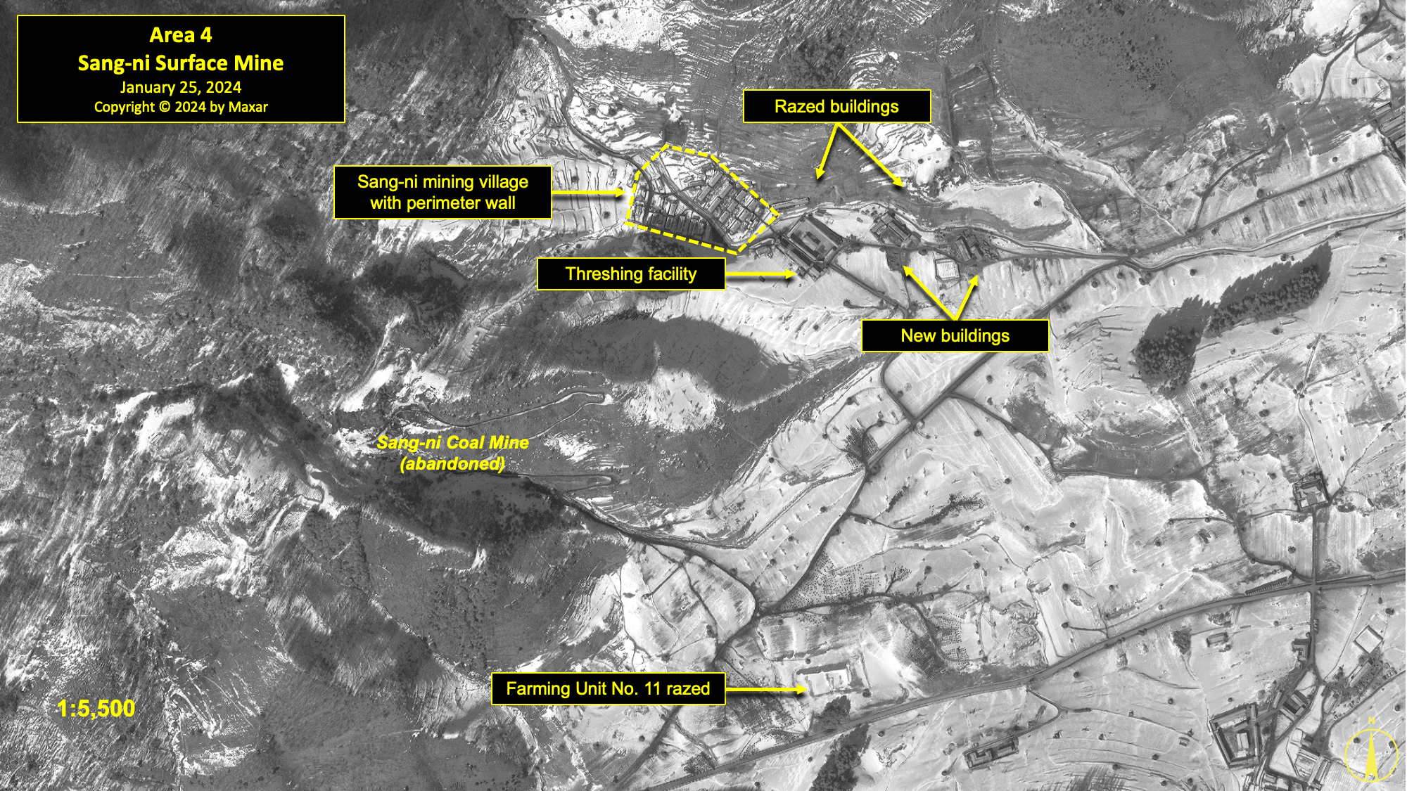 To the west of the Sang-ni Orchard Village and Paramilitary Reserve Training Unit compound are what have been identified by a former detainee as the Sang-ni Surface Mine, Farming Unit No. 11, and a small unnamed village.Ibid.[25] Between 2007 and 2013, the Sang-ni Surface Mine showed little discernible activity. By March 2016, the last remaining building at the mine had been razed. No activity of significance has been noted since, and the coal mine has been abandoned.
