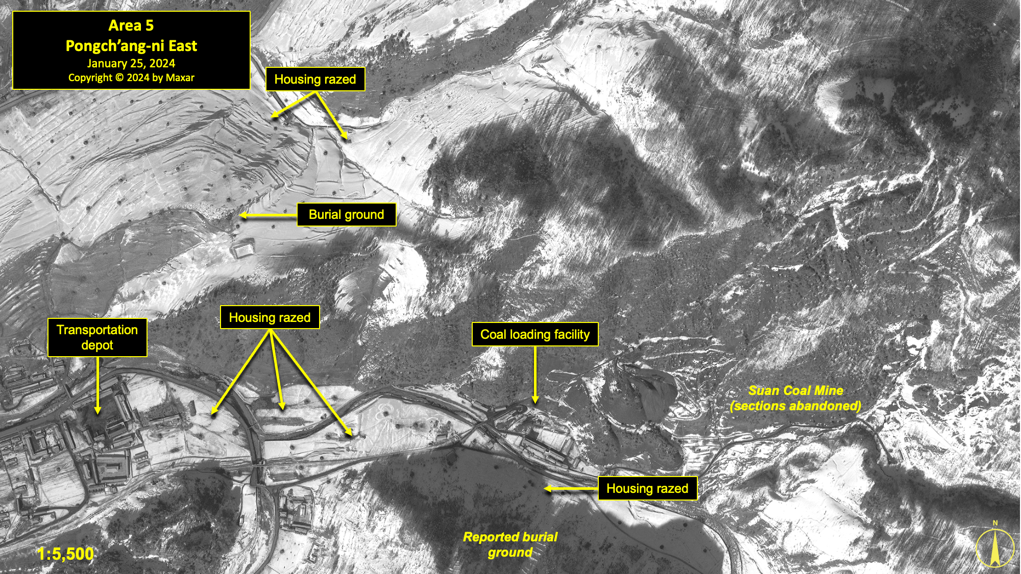 A former detainee identified a third burial ground approximately 650 meters west of the Pongch’ang-ni coal loading station and immediately east of a small unnamed village, where 23 buildings were razed between 2013 and 2017Ibid.[42]with the previous two locations, except for typical agricultural activity, this area has remained unchanged in satellite imagery since at least 2007. Satellite imagery has not detected any indications of burial sites.