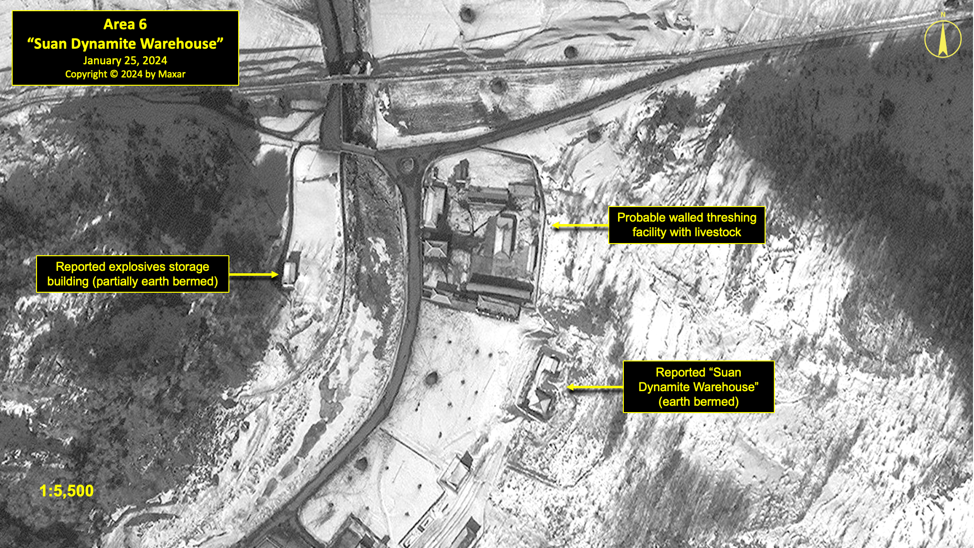 Fifty meters to the south is a small compound with three bermed buildings that a former detainee identified as the “Suan Dynamite Warehouse.” Additionally, there is another partially bermed building 80 meters to the west of this compound that has also been identified as an explosives storage facility. All of these structures are present in all imagery from 2003 to 2024. The three bermed buildings are similar to structures typically used for explosives storage at mines elsewhere in North Korea, including those within other detention facilities.