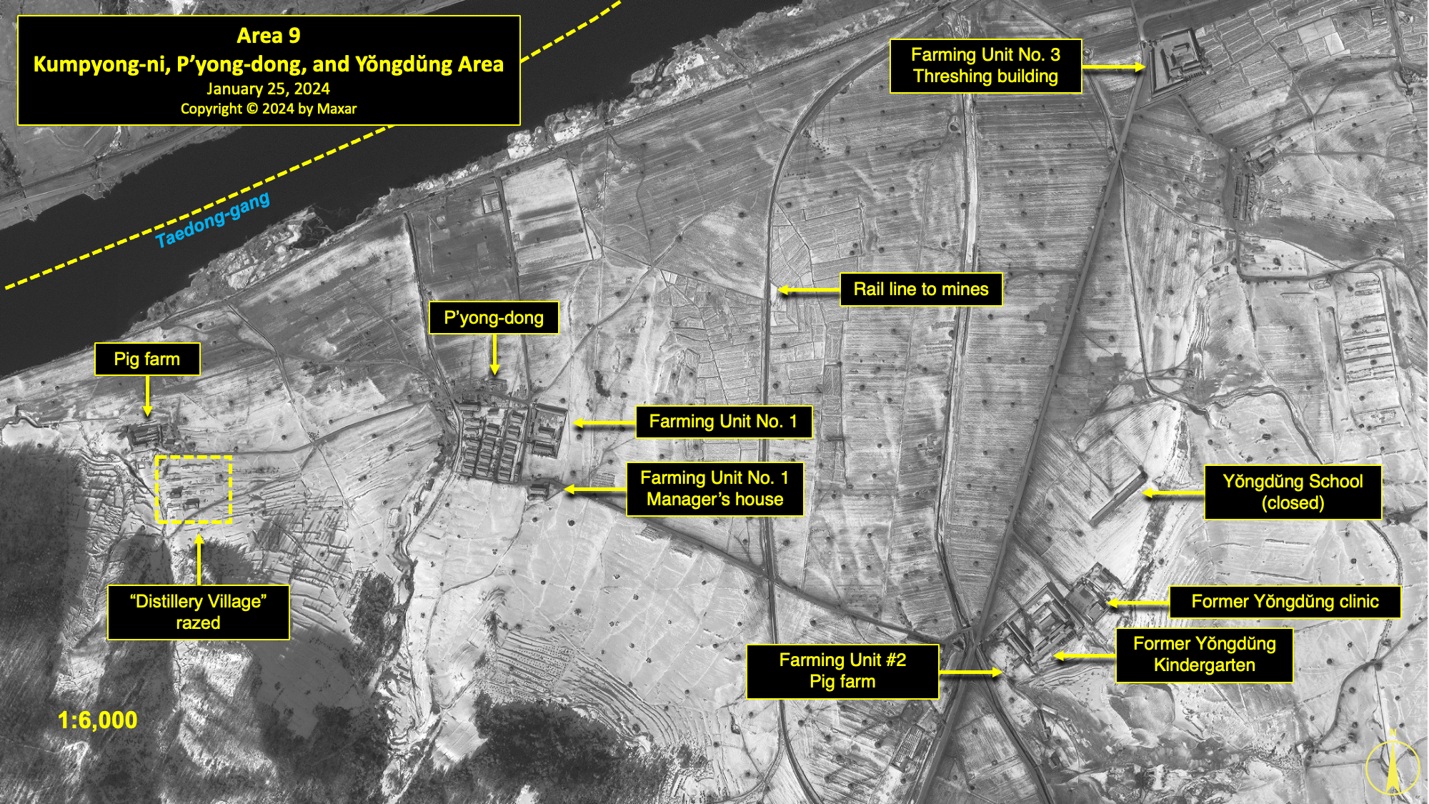 Farming Unit No. 9 is reported to be located in and around the village of Samp’o-dong (sometimes identified as the “New Village”).This is the same 'Farming Unit No. 9' that is referenced in Area 3. According to a former detainee, structures associated with Farming Unit No. 9 are located at both ends of a broad and fertile farming area that stretches between Areas 3 and 5. The structures associated with Farming Unit No. 9 in Area 5 are in the top-left corner of the image, under the title box.[28] This unit is engaged in both agricultural work in the surrounding fields and raising small livestock (pigs). Between 2013 and 2016, a small section of the village on the southeast corner was razed. No significant changes were observed between 2016 and 2024.