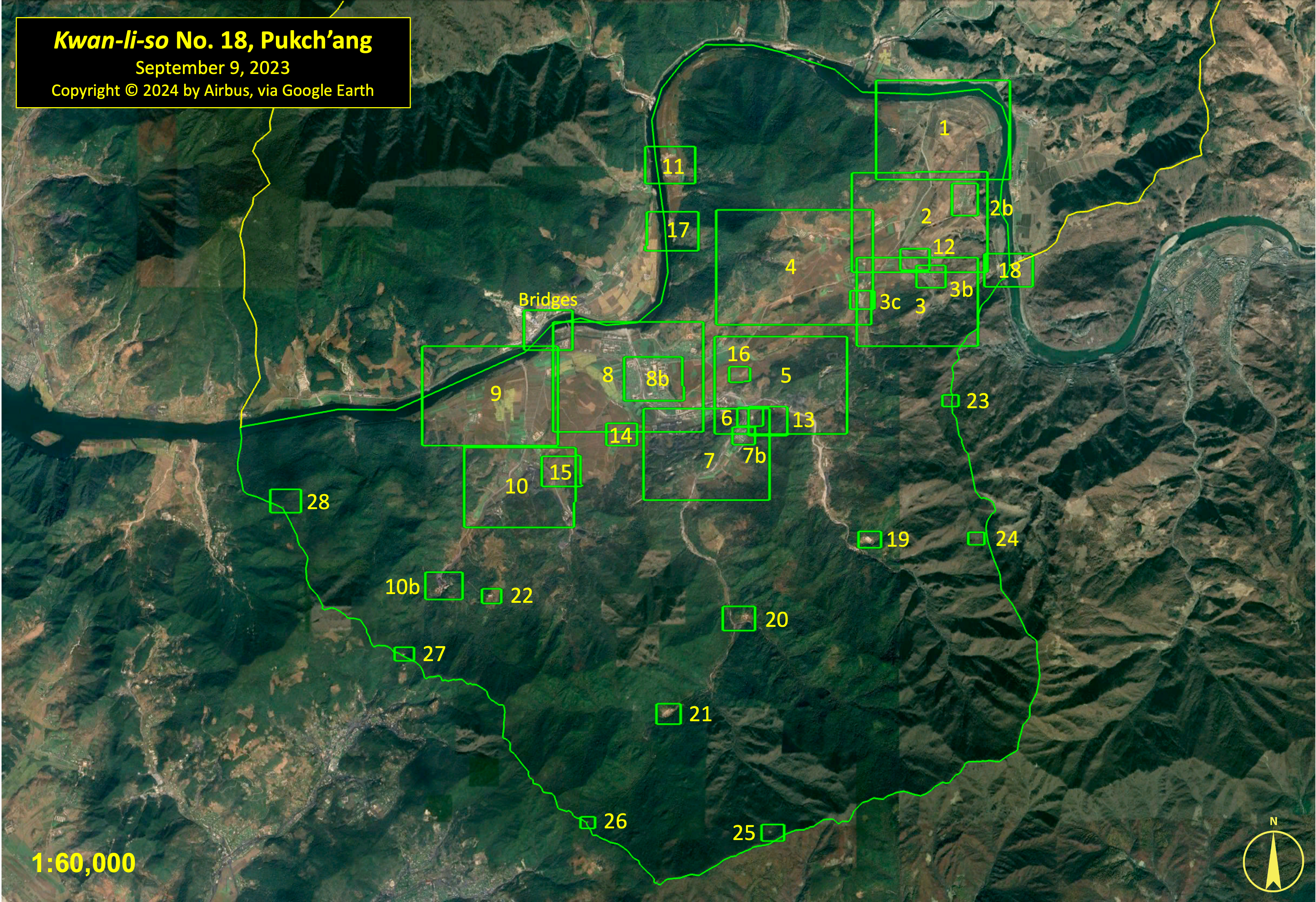 This process, however, did not completely close the camp. New walled facilities, guard barracks, and perimeter guard positions in remote mountainous areas were erected, all within the borders of what was previously known as Kwan-li-so No. 18. This process of razing old facilities and expanding or building new facilities continued through 2016–2017, when it dropped off significantly. Smaller changes have continued until early 2024, indicating that the camp (or its successor organization) remains active, albeit at a reduced level compared to its predecessor.