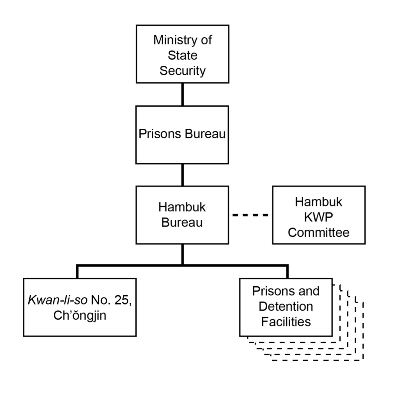 The organizational structure of Kwan-li-so no. 25 is likely similar to that of North Korea's other detention facilities, including its kyo-hwa-so prison labor camps. A provisional organizational structure, based on publicly available information about how North Korea operates its detention facilities, is shown below. There is likely some level of coordination between Kwan-li-so no. 25 and the Ministry of Light Industry, but the camp's relationship with other organizations is unclear.