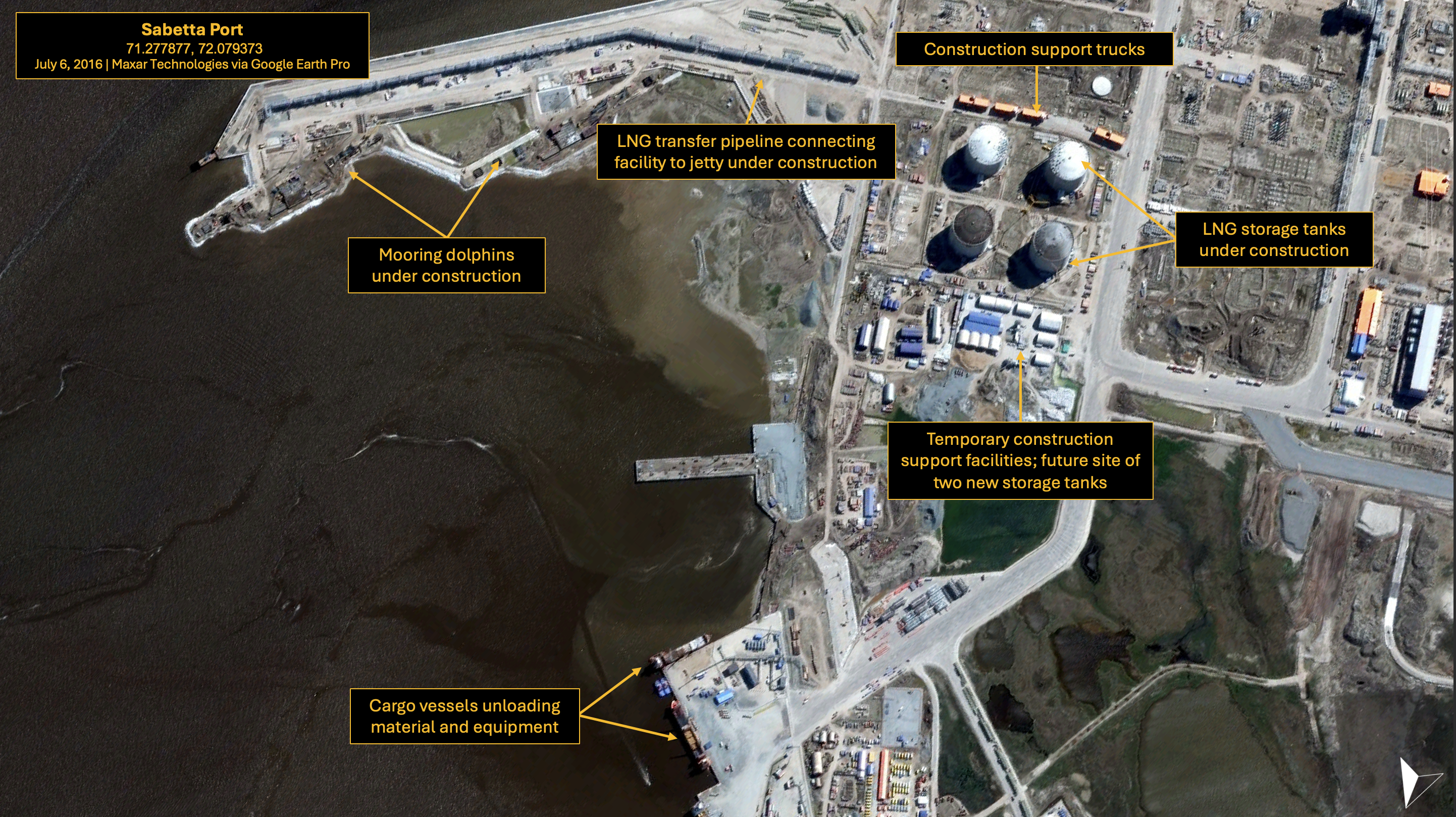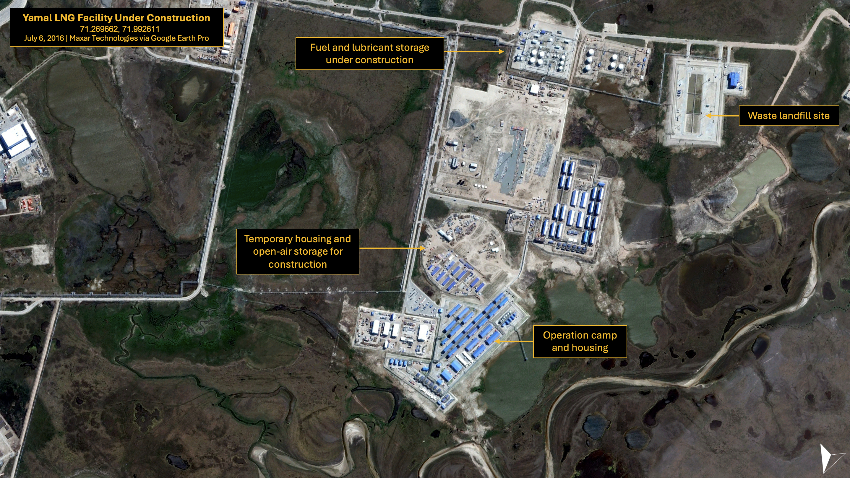 The construction process at the facility is better observed in the next available feasible high-resolution Maxar image, taken two years later, on July 6, 2016. Given the harsh Arctic conditions, the speed of the construction is notable and indicates the high priority of the development of the Yamal LNG facility. Because the Arctic’s permafrost makes construction challenging, 122 modules for the Yamal LNG facility had been fabricated and shipped by 10 different yards from China and Indonesia.Stéphane Le Galles and Michael Borrell, Yamal LNG: Delivering World-Class LNG Project, Investor Day Presentation, TotalEnergies, 2017, https://www.totalenergies.com/media/document/yamal-lng-overview. Modules were fabricated from shipyards in China (Tianjin, Penglai, Qingdao, Zhangjiagang, Qidong) and Indonesia (Batam).[10]