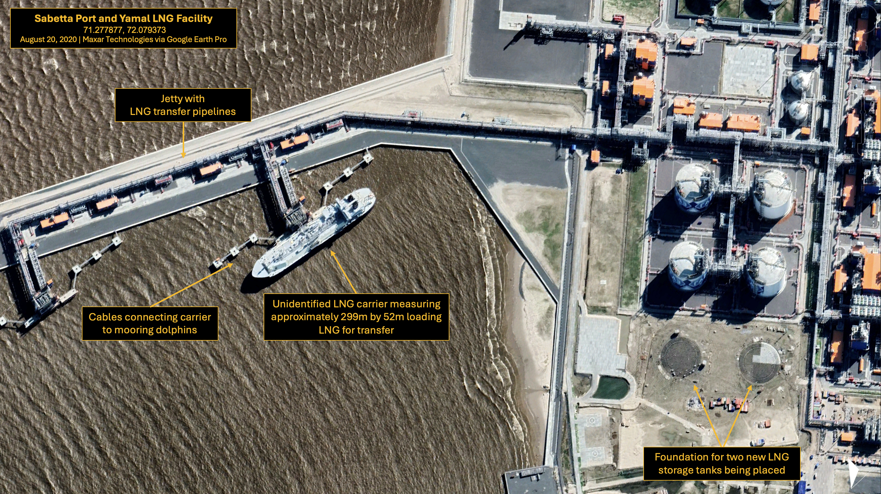 Maxar imagery taken during this period of elevated output, specifically on August 20, 2020, shows indicators of significant levels of activity. At the jetty, an unidentified LNG carrier—potentially a Yamalmax class— which measures approximately 299 meters by 52 meters, is berthed, presumably to load LNG for transfer. North of the jetty and immediately north of the four LNG storage tanks, the foundation for what would later become two new storage tanks is being placed. Although it is yet unclear whether the tanks will store LNG or other materials such as condensate or fuel, the Yamal LNG facility's production exceeding its expected nameplate capacity suggests the tanks will likely be used to store LNG to support the increased output.
