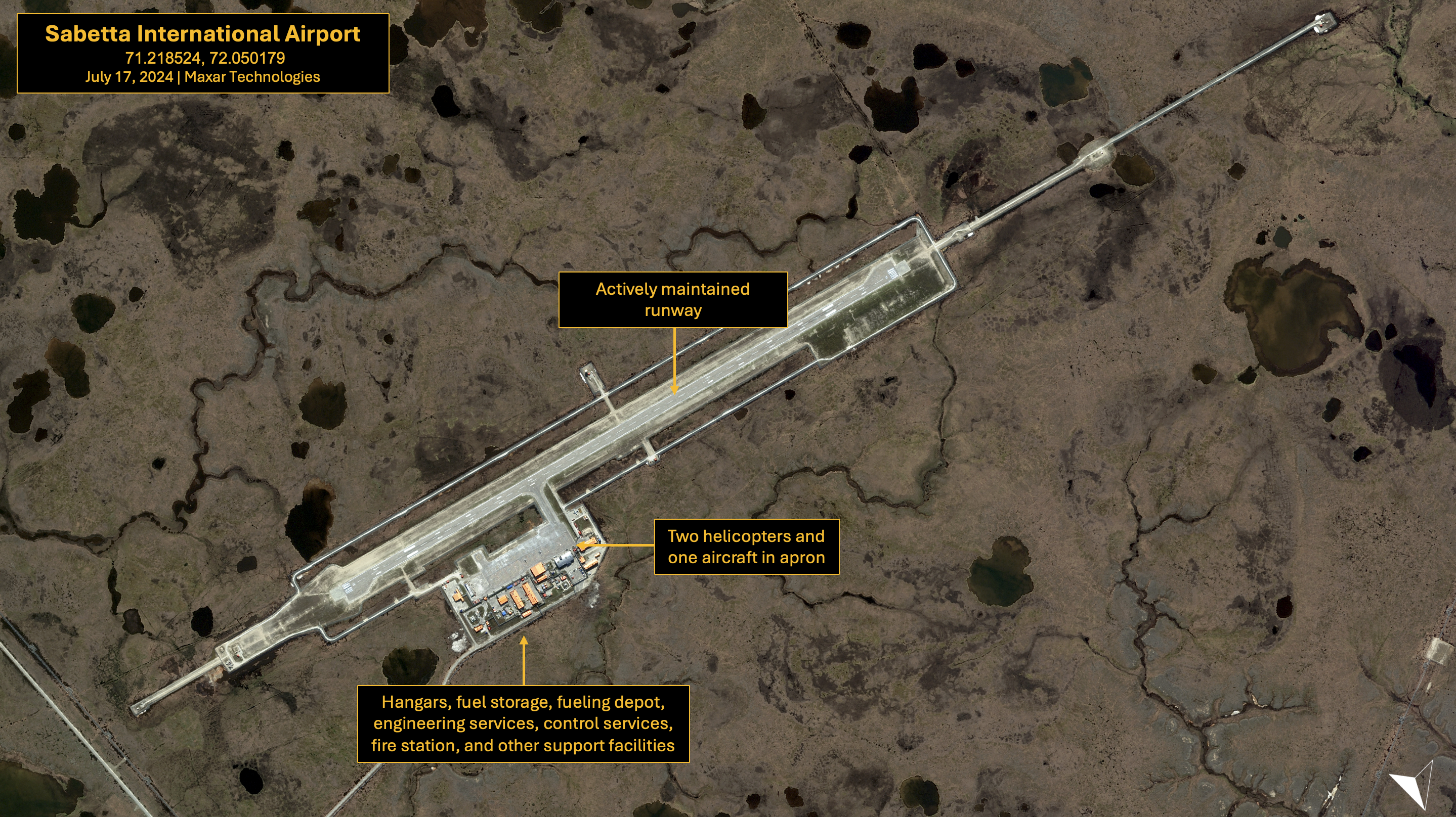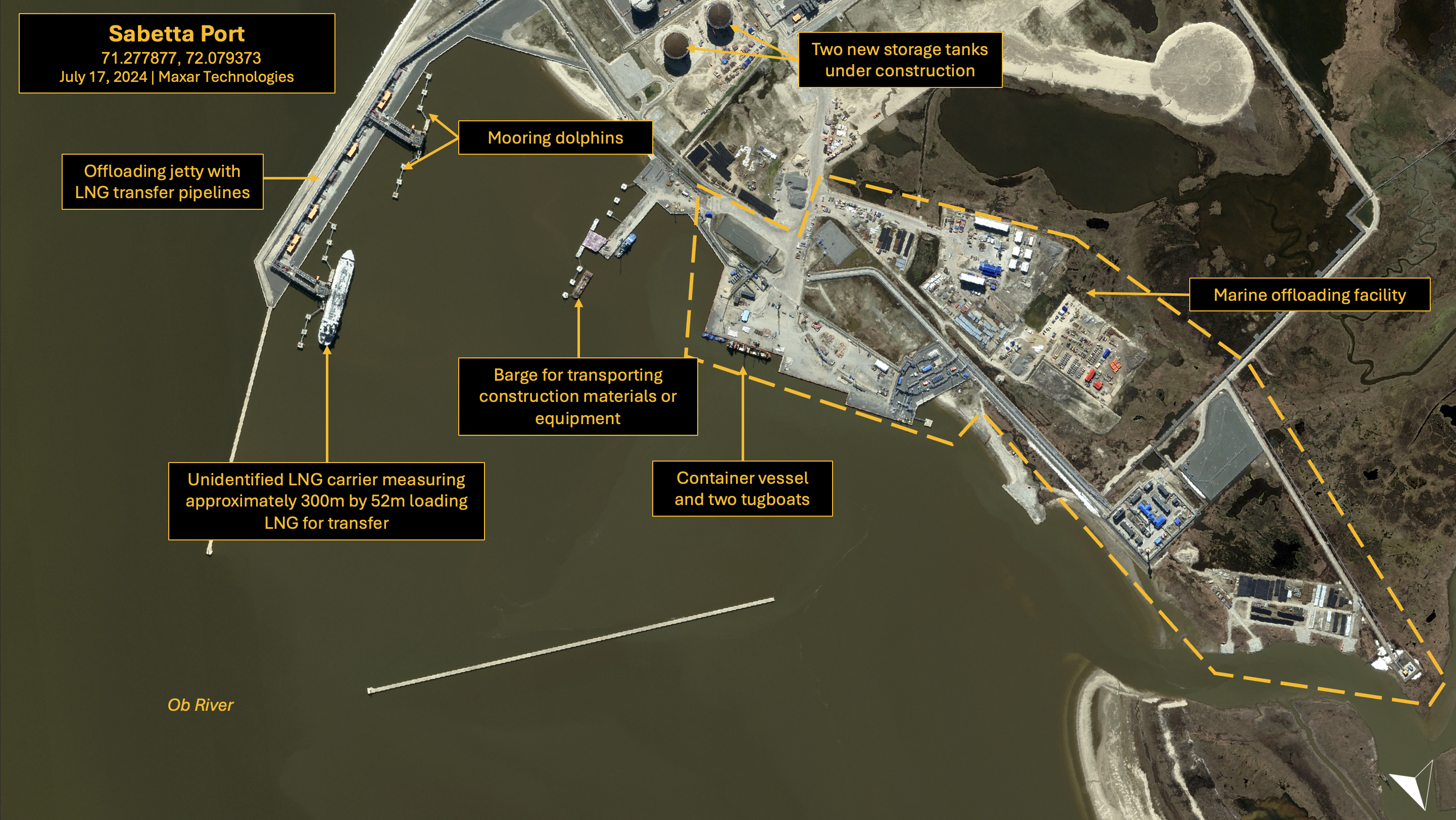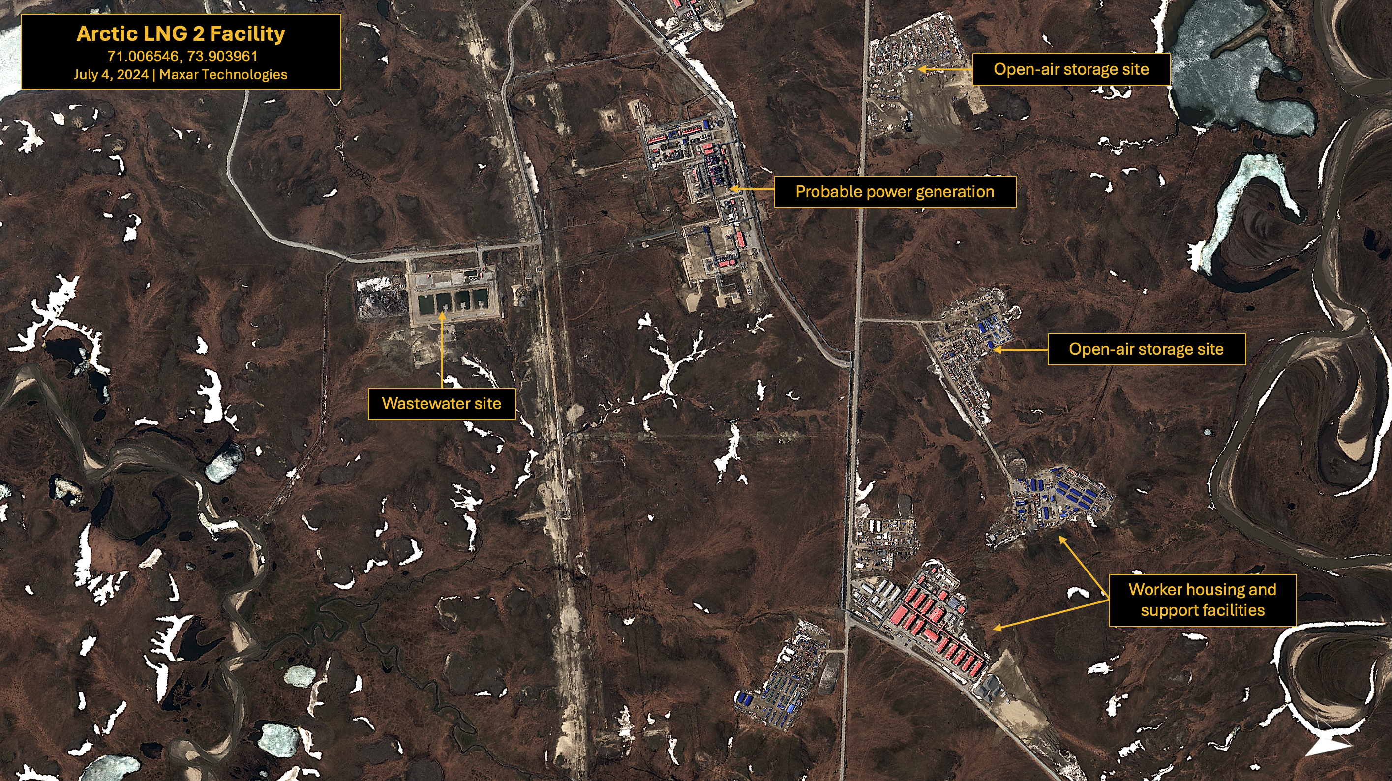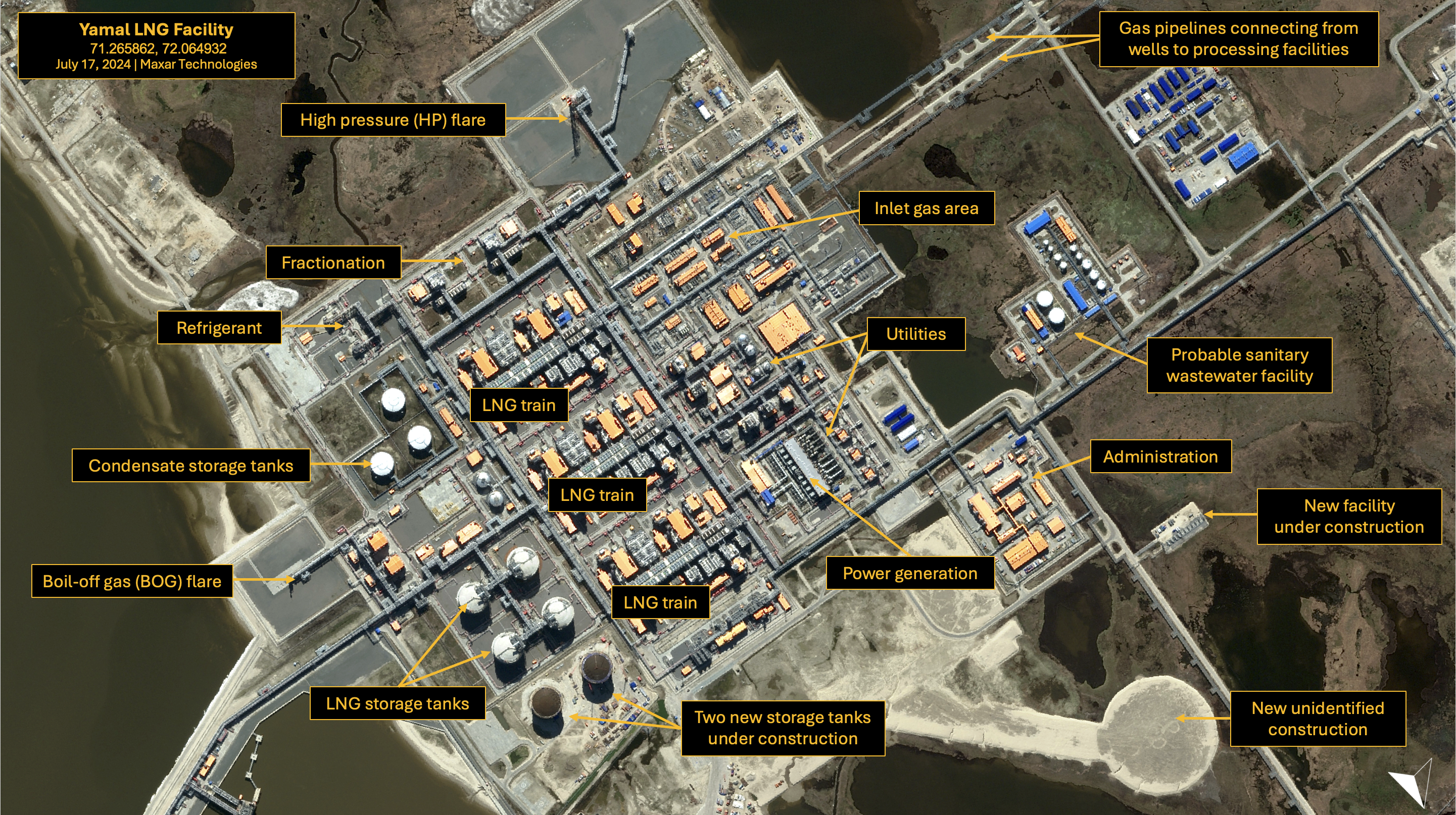 As seen in the latest accessible cloud-free high-resolution satellite imagery from Maxar taken on July 14, 2024, the Yamal LNG facility is supported by Sabetta port and a marine offloading facility to the east, Sabetta International Airport approximately five kilometers to the southwest, and a number of open-air storage yards and support facilities such as worker housing surround the facility.
