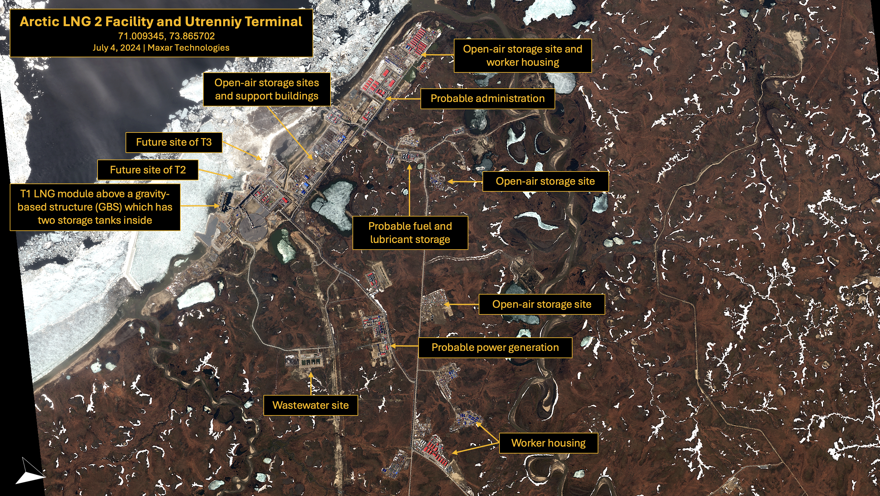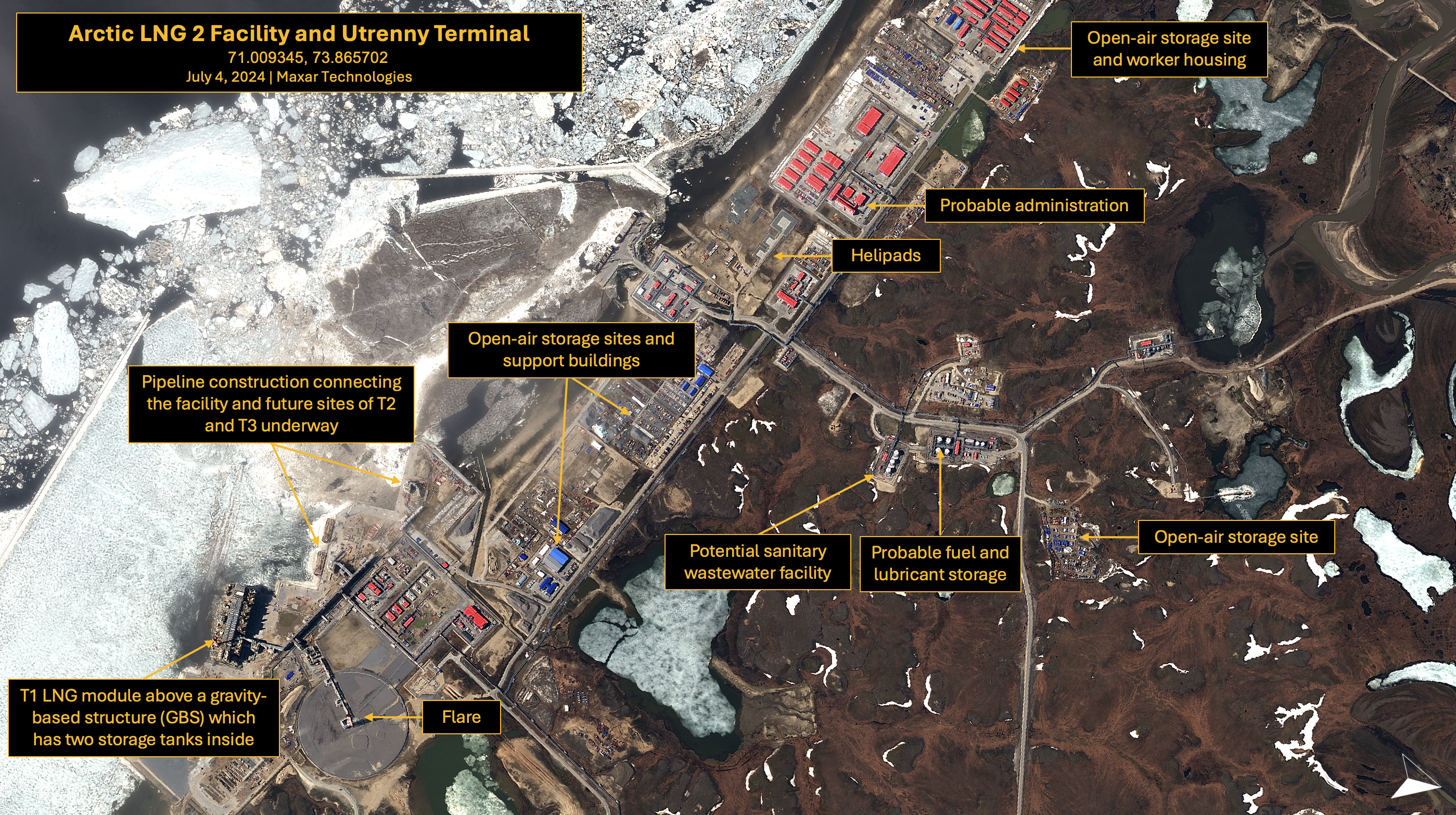 The latest accessible cloud-free high-resolution multispectral image from Maxar taken on July 4, 2024, shows the Arctic LNG 2 facility is supported by Utrenny Airport, approximately 15 kilometers to the east, and the Utrenny Terminal, where the GBS are located. Additionally, a number of open-air storage yards and support facilities such as worker housing surround the facility.