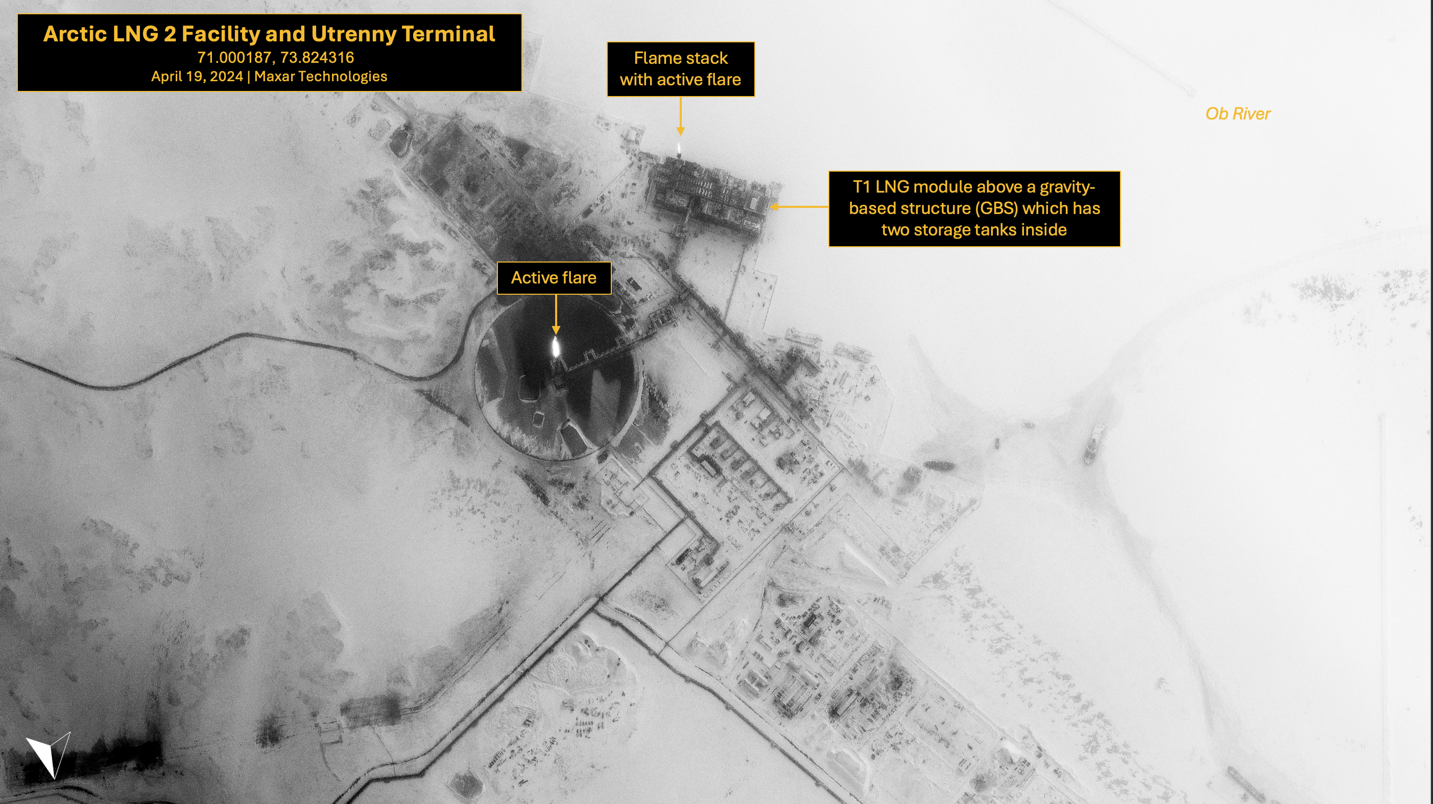 With T1 in place, the train was commissioned four months later in December 2023, when operations and production at the facility officially started.Upstream Online, “Arctic LNG 2’s Second Train Nears Commissioning After Power Plant Arrival,” Upstream Online, October 17, 2023, https://www.upstreamonline.com/energy-security/arctic-lng-2s-second-train-nears-commissioning-after-power-plant-arrival/2-1-1732100; Reuters, “Russia's Novatek to Start Delivering Equipment for Arctic LNG 2’s Next Phase in July,” Reuters, June 27, 2024, https://www.reuters.com/business/energy/russias-novatek-start-delivering-equipment-arctic-lng-2s-next-phase-july-2024-06-27/.[36] Although cloud-free and feasible satellite images are rare in the winter and early spring months, an image taken on April 19, 2024, show active flares at the onshore facility as well as at the flame stack on T1, indicating operation.