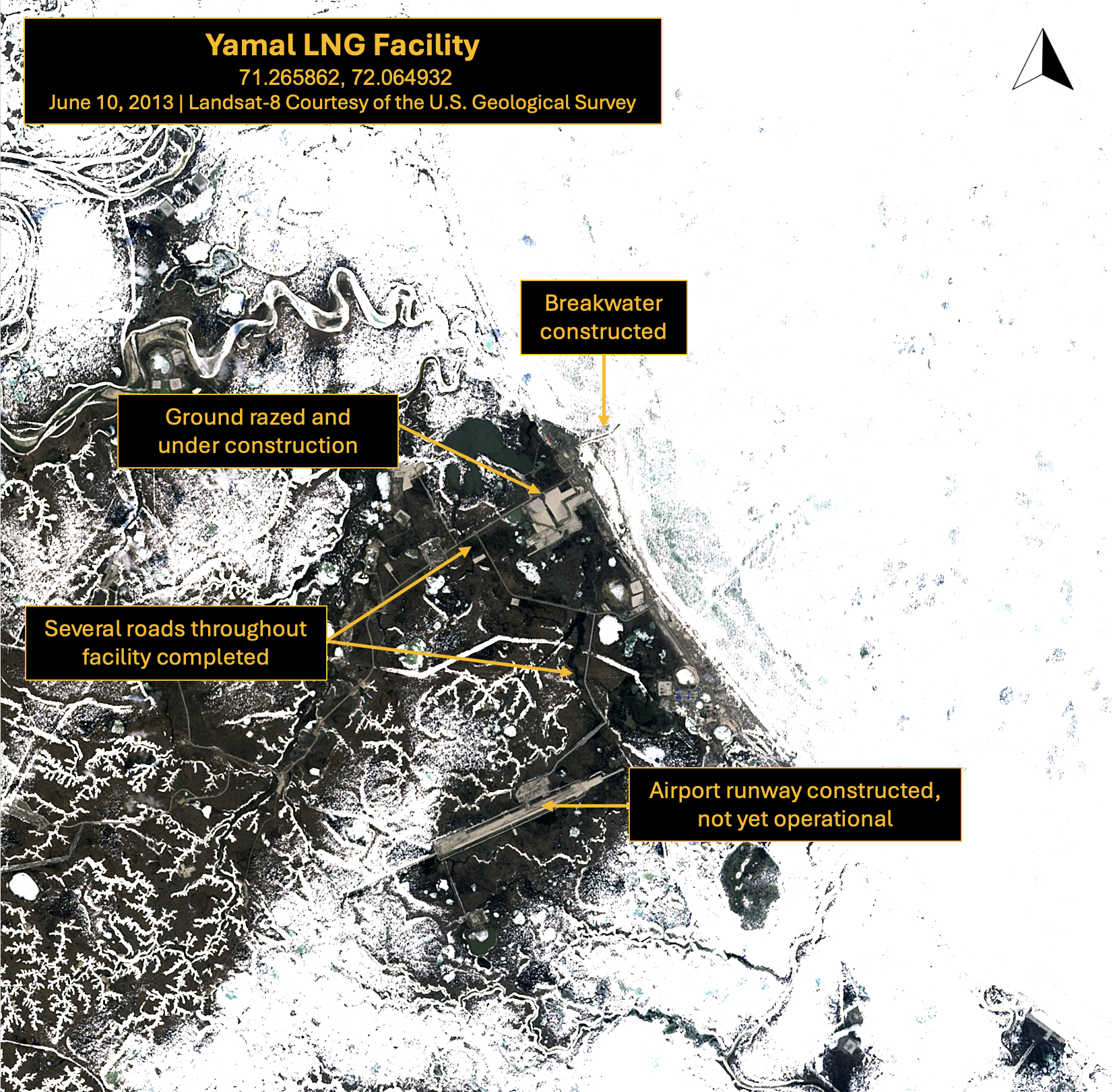 The Yamal LNG facility project was officially approved by the Russian government in 2010 and officially licensed three years later in 2013, when facility construction started.Novatek, Yamal LNG: An International Gas Export Project, Novatek Official Website, March 20, 2013, https://www.novatek.ru/common/upload/doc/2013_03_20_Yamal_LNG_ENG.PDF; International Gas Union, 2017 World LNG Report, 2017, https://www.igu.org/resources/2017-world-lng-report/.[8] The facility’s two supporting infrastructures, the Sabetta port and Sabetta International Airport, were also operational around this time, with the port’s berths operational since November 2013 and the airport’s first landing occurring in December 2014.Stéphane Le Galles and Michael Borrell, Yamal LNG: Delivering World-Class LNG Project, Investor Day Presentation, TotalEnergies, 2017, https://www.totalenergies.com/media/document/yamal-lng-overview.[9] A medium-resolution Landsat-8 image from June 10, 2013 shows the development of a breakwater at what would later become the port, and the airport runway visible. It also shows the completion of the main roads throughout the facility and its surrounding areas, as well as the beginning of construction of the plant grounds.