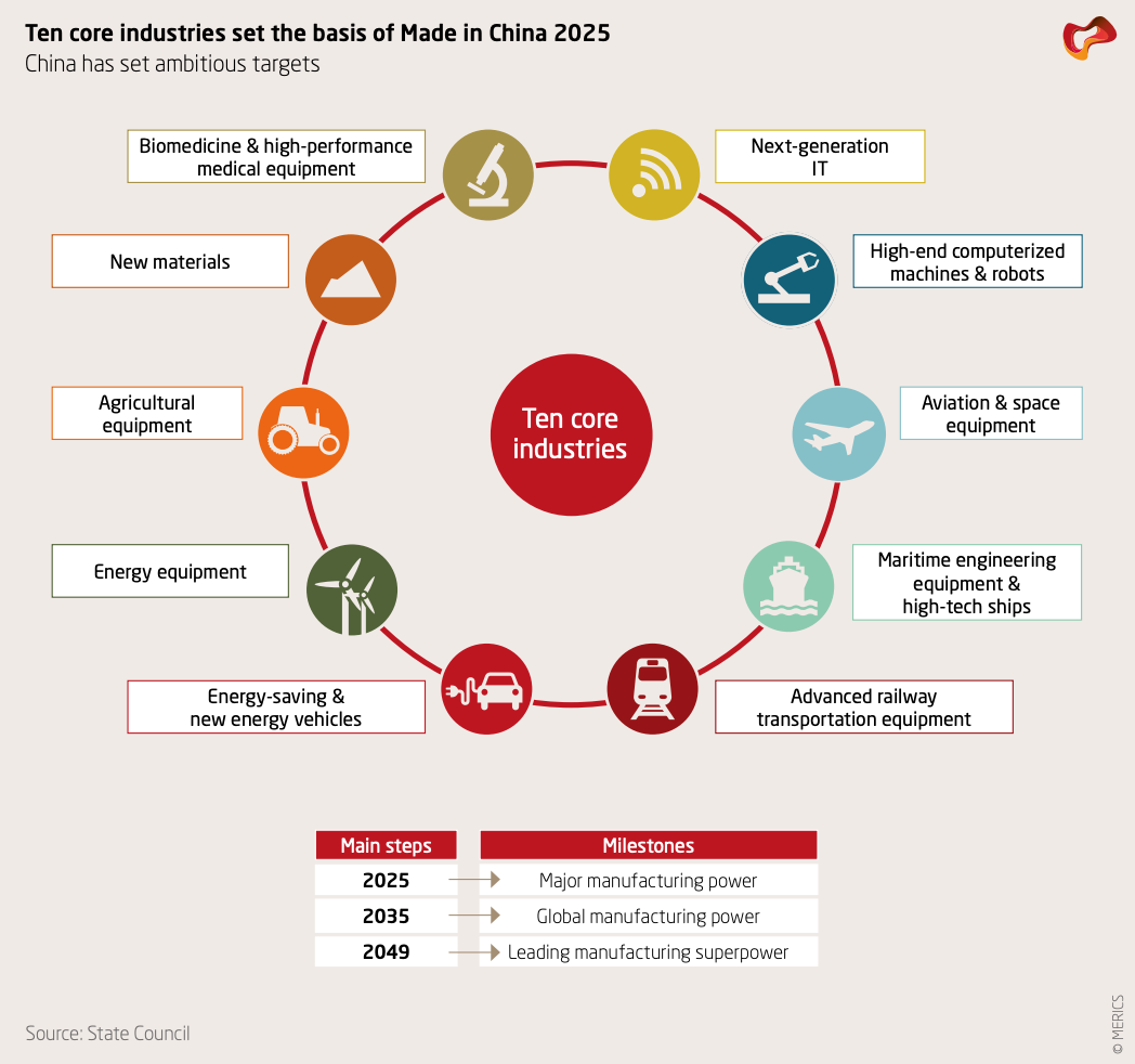 In 2015, the Chinese government implemented the Made in China 2025 (MIC25) policy, which aims to make China self-sufficient by promoting technical innovation and developing the key industries outlined in Figure 1. It uses incentives like favorable taxes or research subsidies alongside mandates like forced joint ventures to promote these industries. For more information about MIC25, see part one of our study.