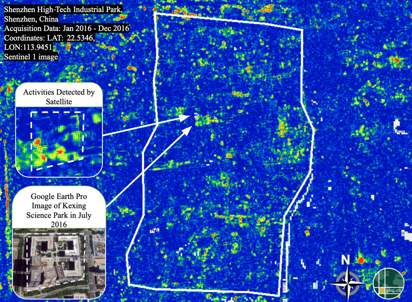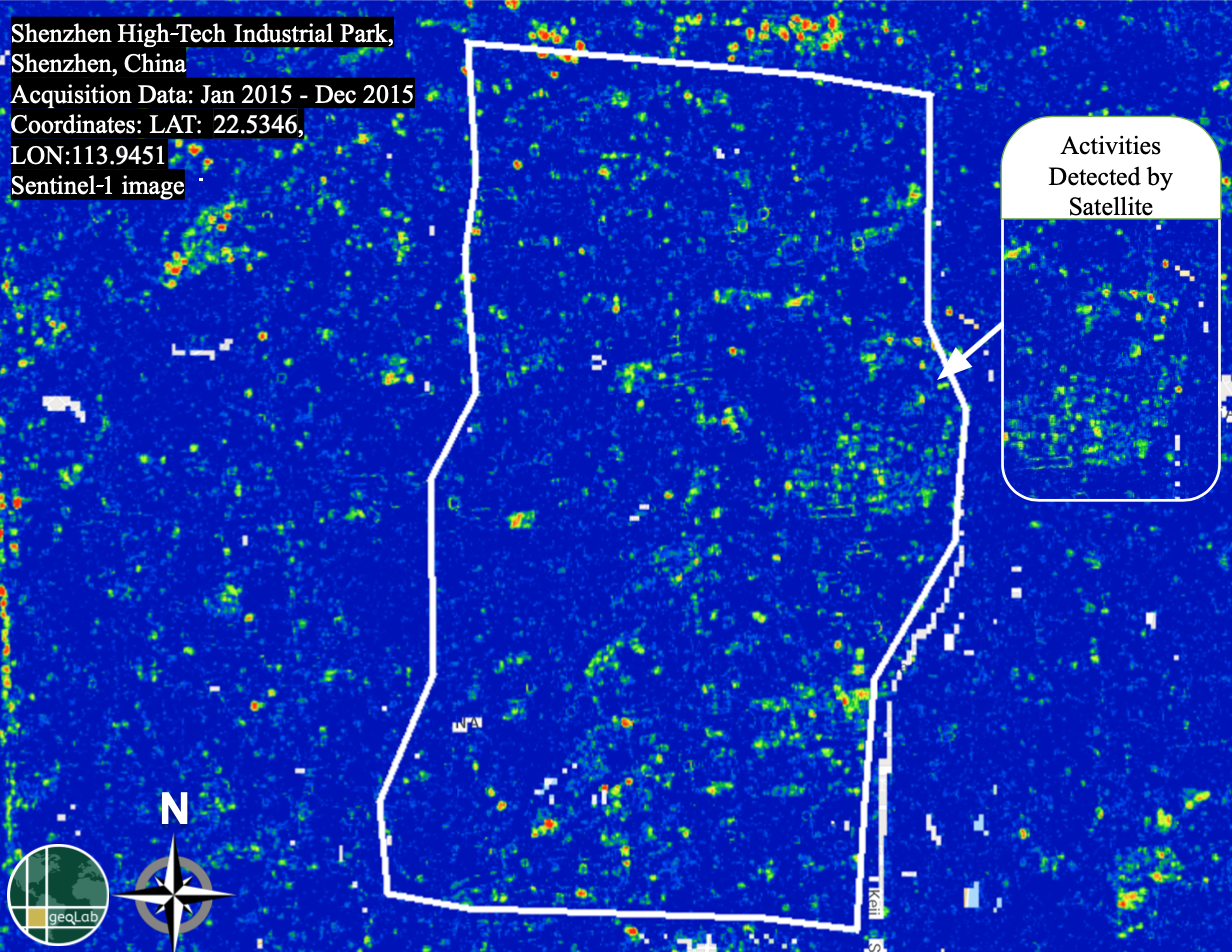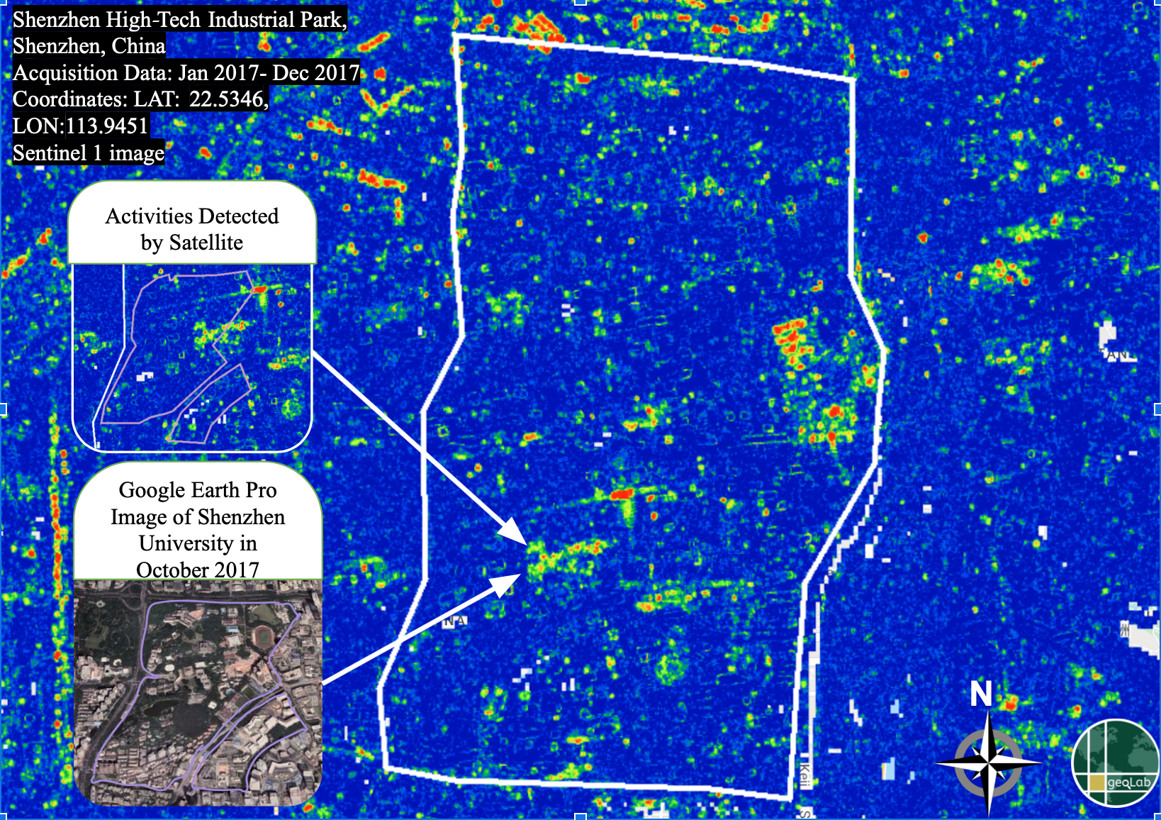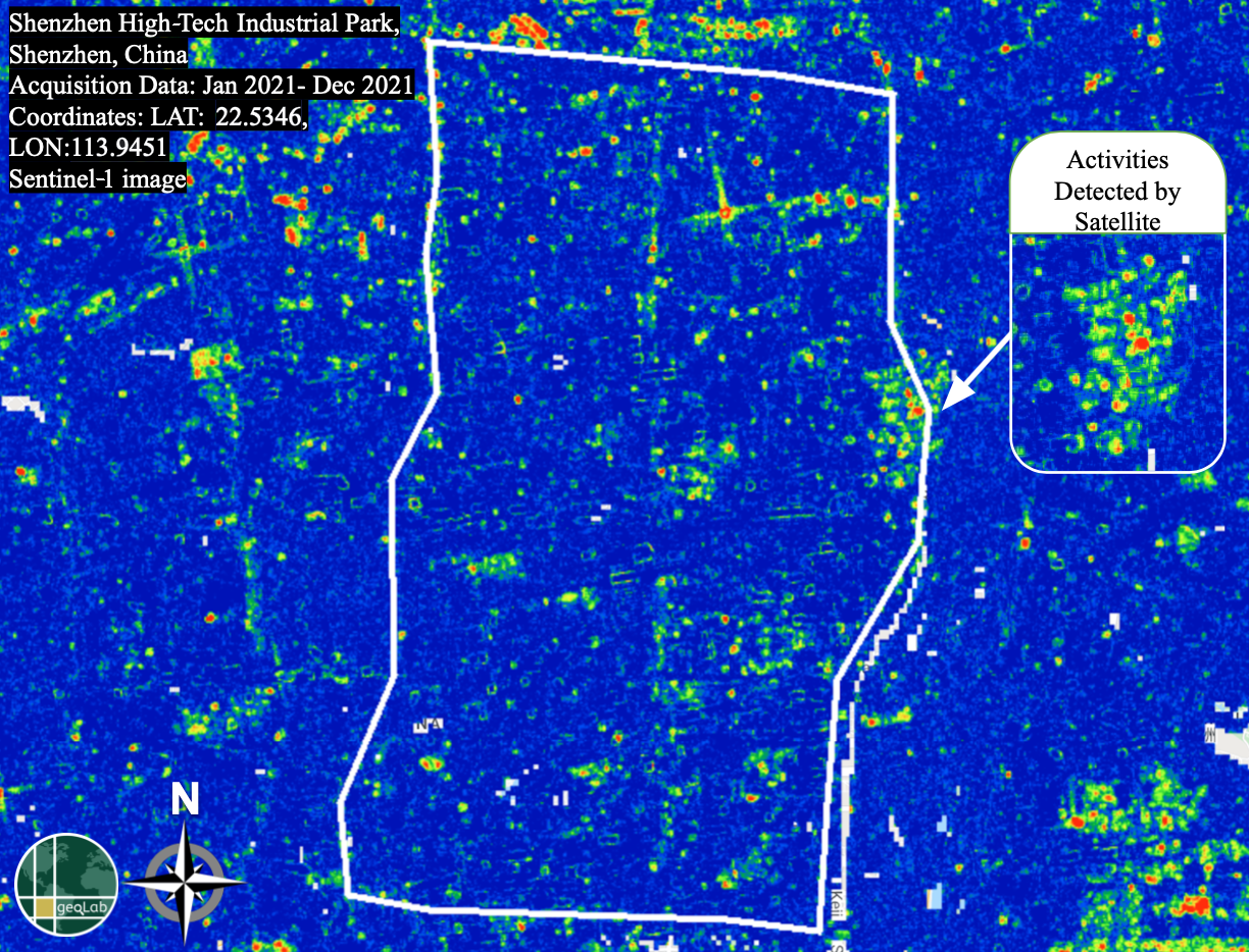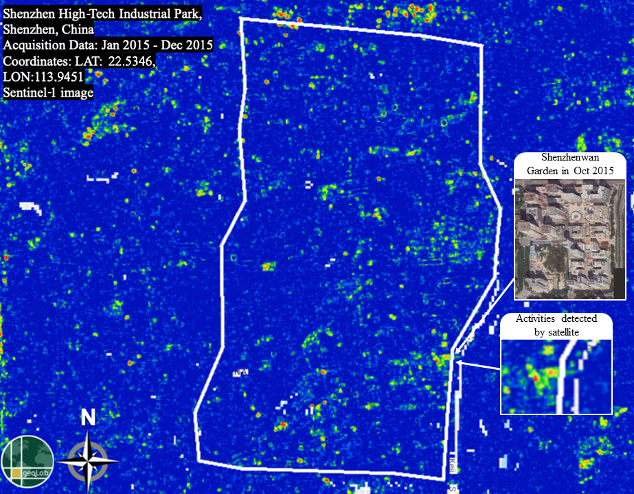 Figure 4 depicts our SAR data from Shenzhen High-Tech Industrial Park between January 2015 and December 2021. Warmer hues (yellowish) indicate areas where activity (detected as a positive change in total backscatter) has occurred over the selected time period, with darker hues (red) indicating more intense activity. Cooler hues indicate areas where less activity was detected, with dark blue indicating no new activity (no change in total backscatter).