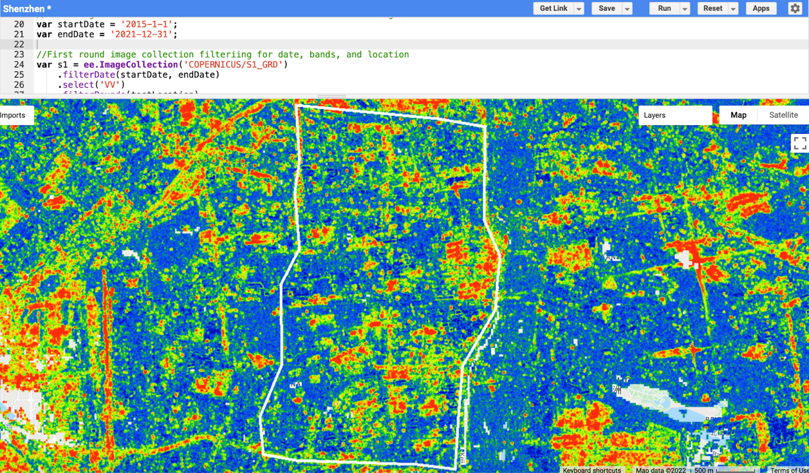 To detect construction and other activity in the industrial park, we created an activity and change alerting and detection service within Google Earth Engine, using open synthetic aperture radar (SAR) data collected by Sentinel-1. This SAR activity/change service detects changes in radar backscatter over time caused by moving vehicles, construction, or natural phenomena. The change in backscatter was analyzed over the seven-year timeframe from January 2015 to December 2021 to identify areas of increased activity (for more details, read our earlier article that leveraged similar SAR techniques). A sample of the Google Earth Engine script can be seen in Figure 2. Detected activity hotspots were further investigated using electro-optical satellite imagery and previously mentioned open-source data sources to determine what type of development was occurring.