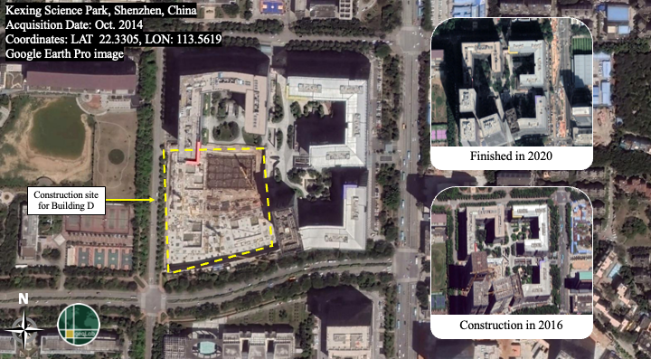Much of Shenzhen High-Tech Industrial Park's development since 2015 has been in the advanced industrial sectors targeted by MIC25. One example of this development is Kexing Science and Technology Park, located in the central district of Shenzhen High-Tech Industrial Park (Figure 8), which is a recently constructed business park consisting of four buildings. Figure 9 depicts its construction from 2014 to 2020. Kexing Science and Technology Park is designed to attract companies by offering rentable offices and amenities including its proximity to public transportation and commercial areas.