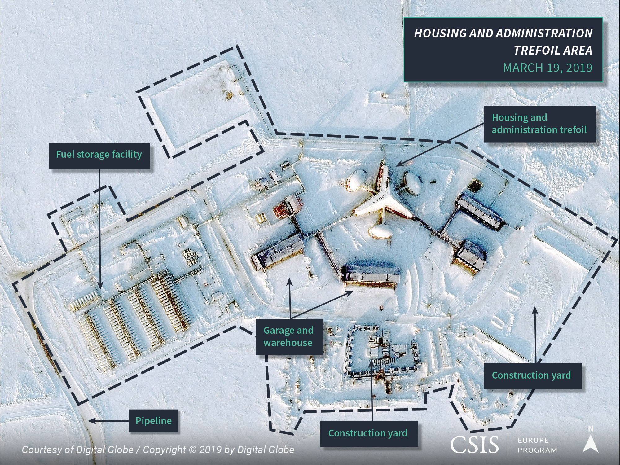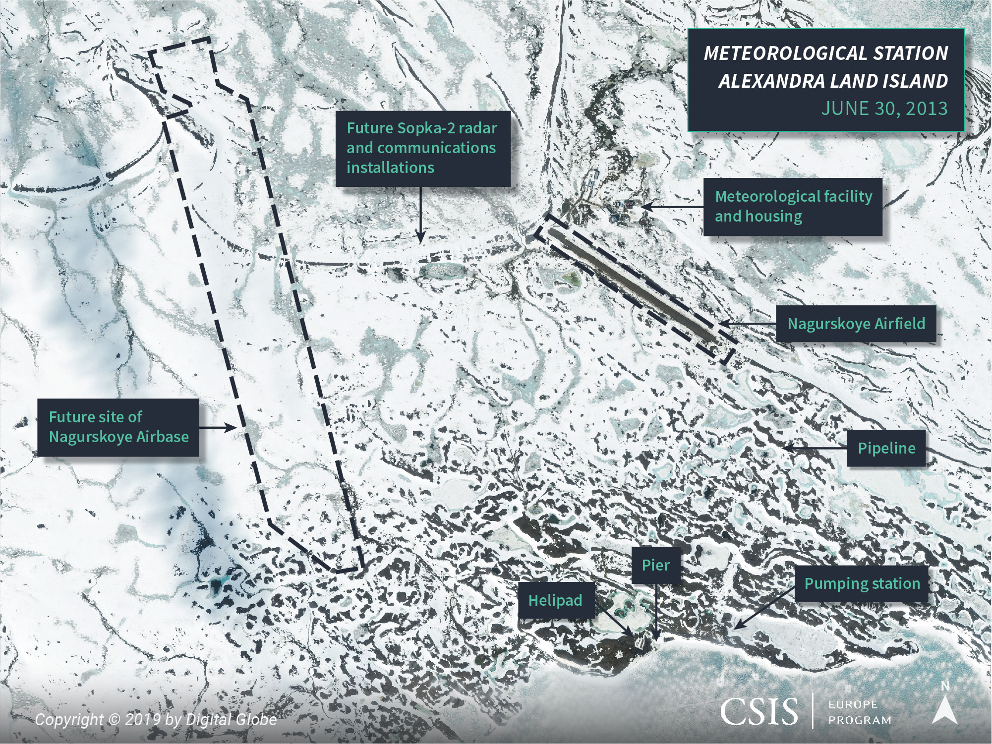 Five years later in 2013, the Russian Defense Ministry announced that would reestablish a regular naval and military presence in the Arctic.3 As part of its plan, the meteorological station on Alexandra Land would be supplemented by the addition of permanent military facilities that would include a new airbase, housing and administration trefoil, air traffic control and air defense units and radars, and other support installations.4