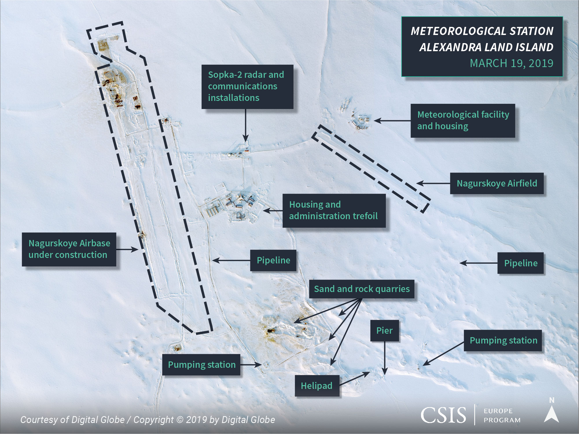 Alexandra Land Island (Ostrov Zemlya Aleksandry) is the largest island in Russia's Franz Josef Land Archipelago (Zemlya Frantsa-Iosifa), and its strategic importance to Russia's national defense and presence in the Arctic dates back to the early 1950s.1 During the Cold War the former Soviet Union established and maintained the Nagurskoye Airbase, which included the 31st Separate Radar Company, a meteorological station, a small dirt/snow airfield (known as the Nagurskoye Snow Strip), and likely small signal and communication intelligence collection units. Following the collapse of the Soviet Union, these facilities were substantially reduced to a FSB [Federal Security Service] border post (30 persons), Arctic specialists (16 persons) and meteorologists (six persons) who lived and work there.2